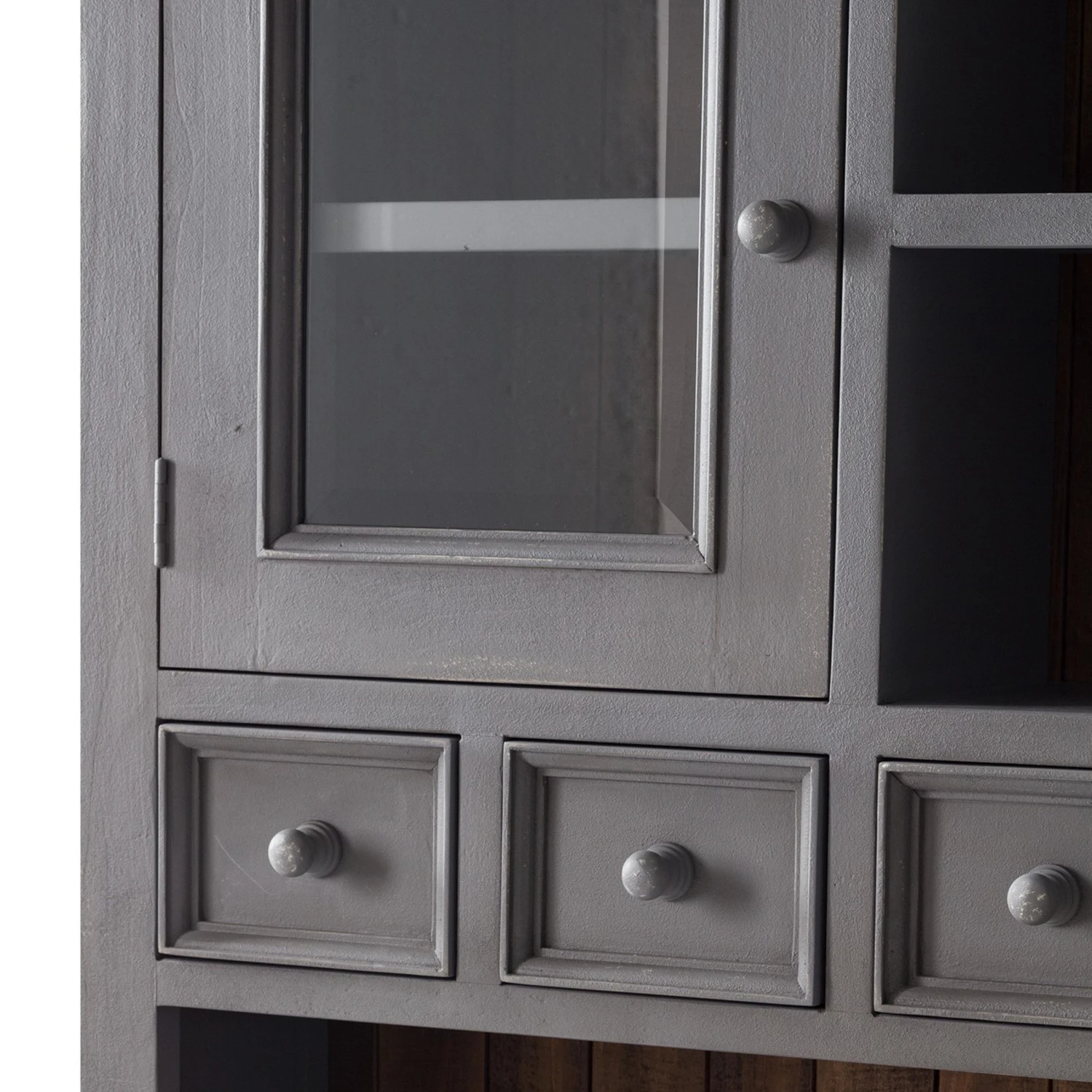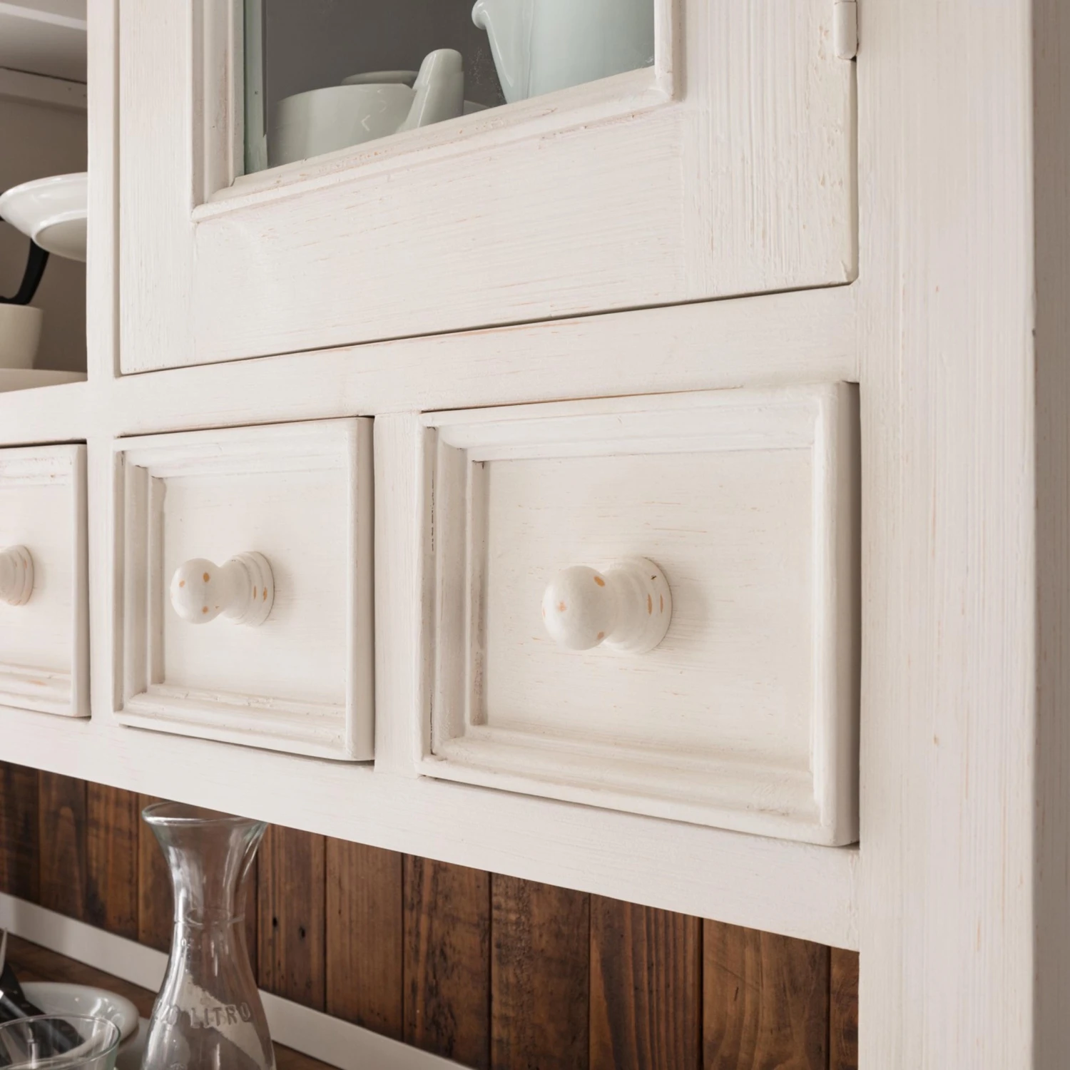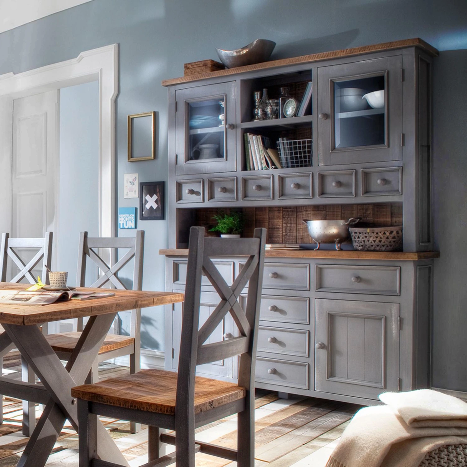 Der massive Buffetschrank Balignton ist in qualitativer handwerklicher Tradition aus lackiertem Kiefernholz gefertigt. Die individuellen Abnutzungsspuren unterstreichen den modernen Shabby-Chic-Look. Besonderes Highlight sind die Etage und die Holzpaneele aus recyceltem Pinienholz. Durch den Einsatz der kostbaren Naturmaterialien ist jedes Möbelstück ein Unikat. In den diversen Schubladen sowie Fächern und hinter den zahlreichen Türen finden Geschirr, Besteck, Gläser und mehr einen sicheren Platz zur Aufbewahrung im Buffetschrank Balignton. Hinter den beiden Glastüren können besondere Stücke gezielt in Szene gesetzt werden.