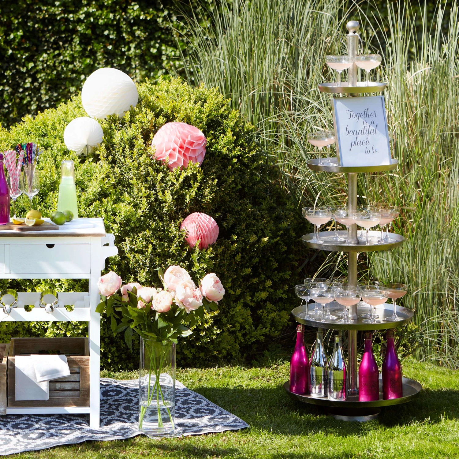 Stattliche 170 cm ragt die silber glänzende Banquette Etagere mit 5 Ebenen in die Höhe, auf denen Kerzen, Teelichter, Deko-Objekte, Weihnachts- oder Osterschmuck und allerlei andere Hingucker auf schmucke Art zur Geltung kommen.