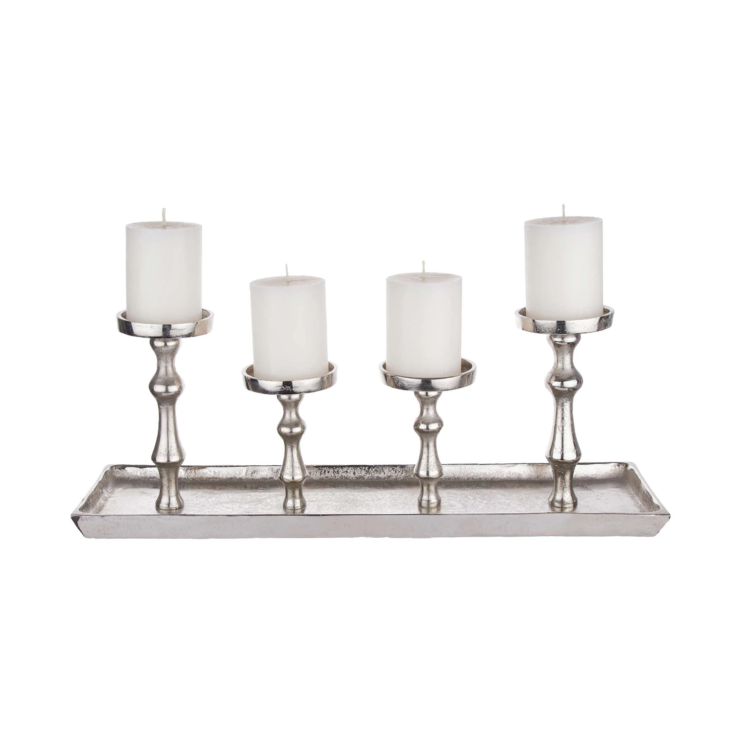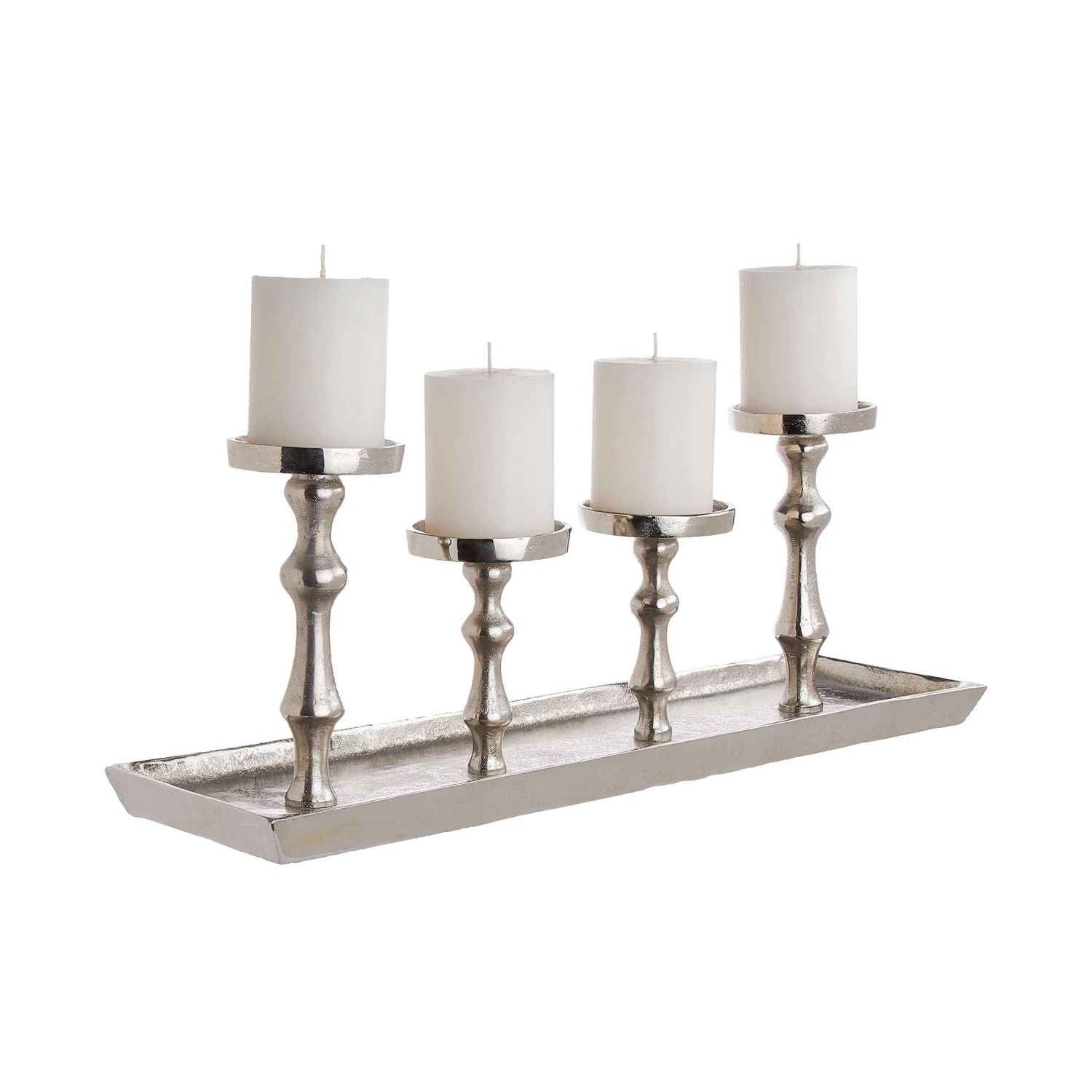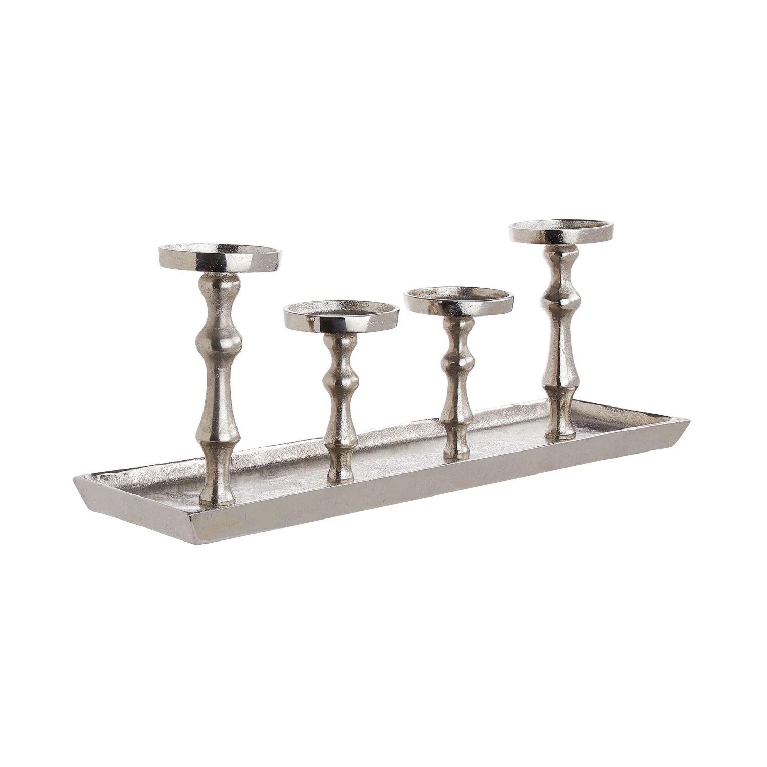 Jetzt wird´s opulent: Mit dem Banquet Tablett mit 4 Kerzenhaltern in schillerndem Silber wird Ihr gedeckter Tisch zur festlichen Tafel und Ihre edle Deko zum glamourösen Schmuck.