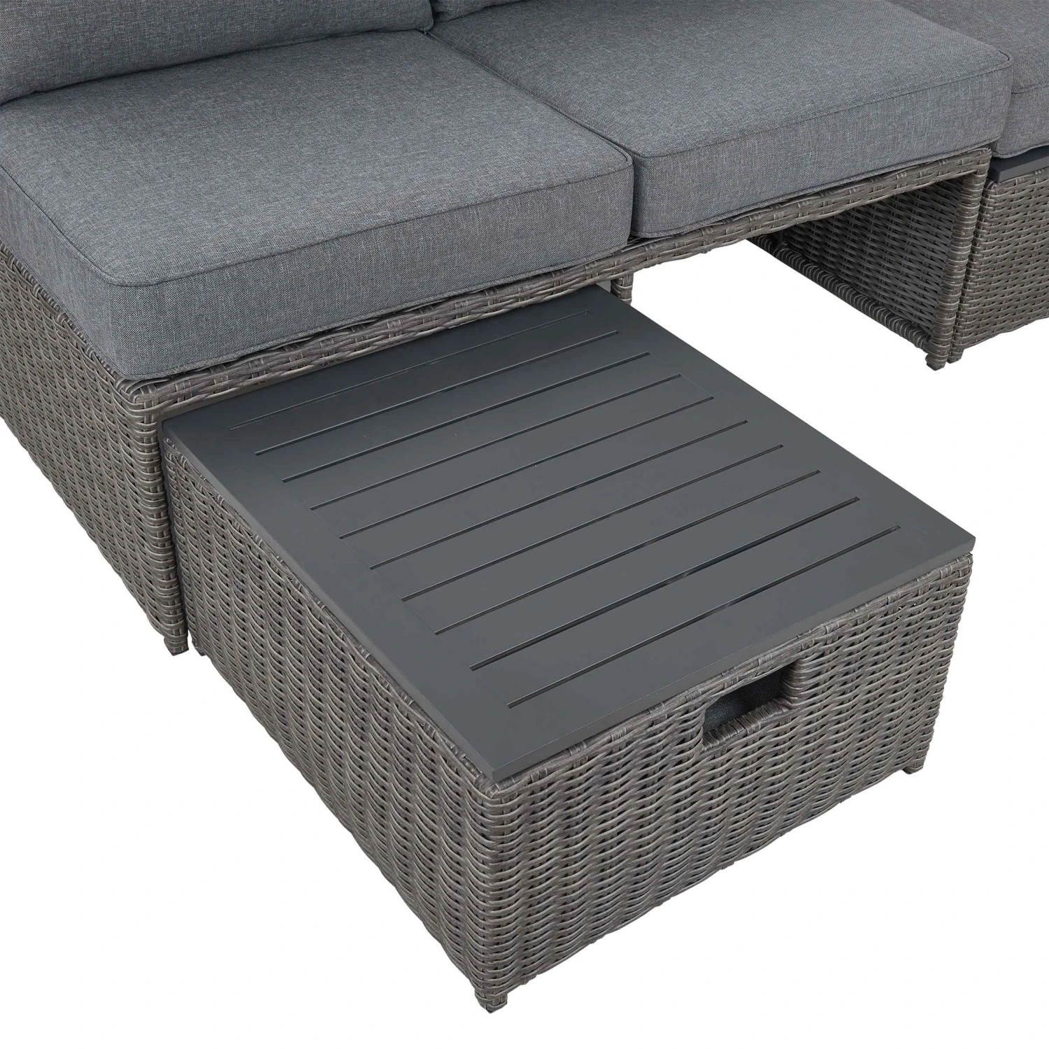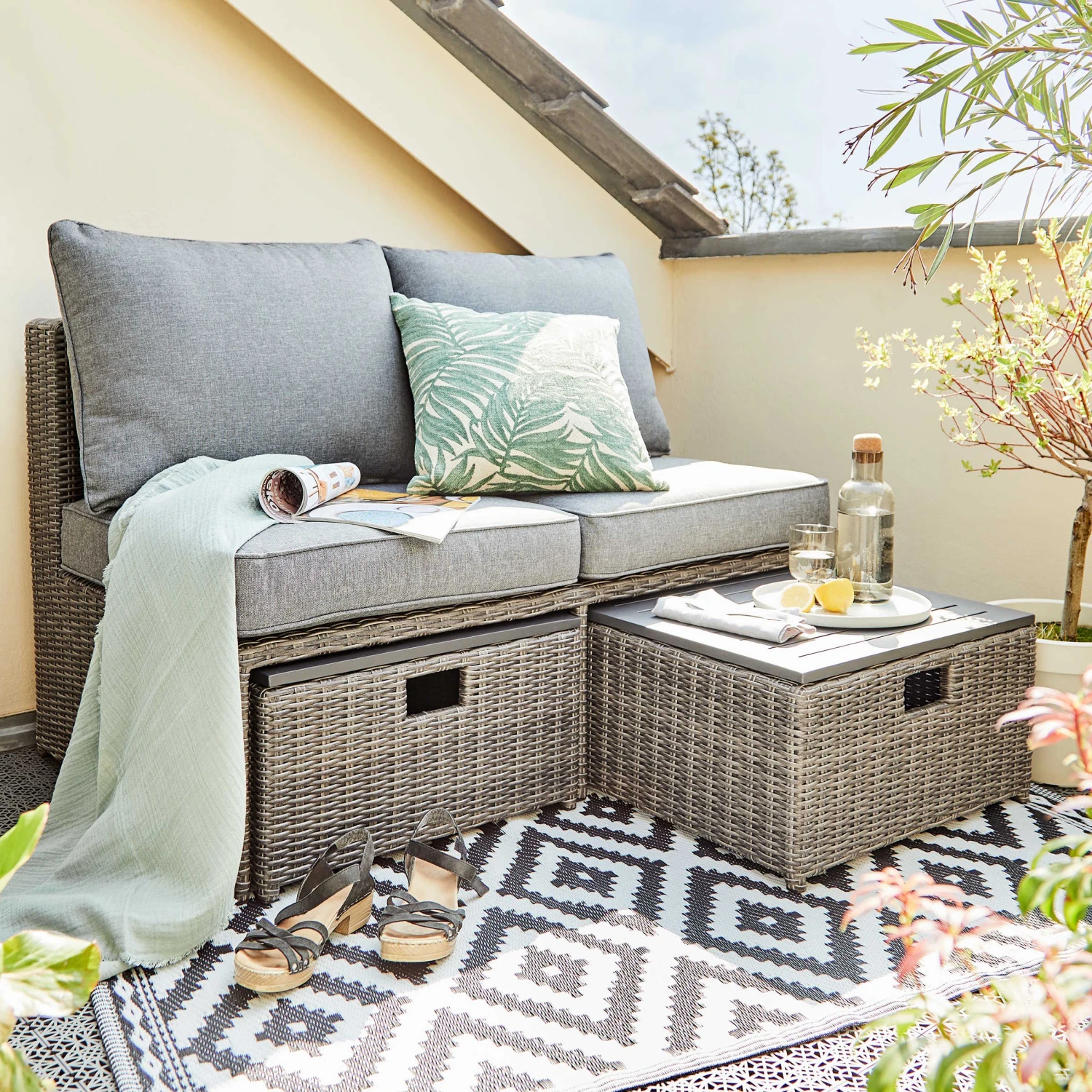 Ganz groß in Sachen Vielseitigkeit: Mit dem cleveren Block Party Loungesofa richten Sie sich auch auf dem kleinen Balkon perfekt ein. Dank verschiedener Stellmöglichkeiten passt sich die Lounge-Ecke an den vorhandenen Platz und Ihre Lieblingssitzposition an. In den Fußteilen mit praktischem Stauraum verschwinden Balkonutensilien wie Gärtnerzubehör, Stuhlkissen & Co., das schafft extra Platz und Ordnung. Auch in puncto Qualität hat es das Block Party Mini-Loungeset in sich: Bei diesem handgewebten Möbelstück wertet halbrunder Kunstrattan das wetterfeste Geflecht zusätzlich auf.