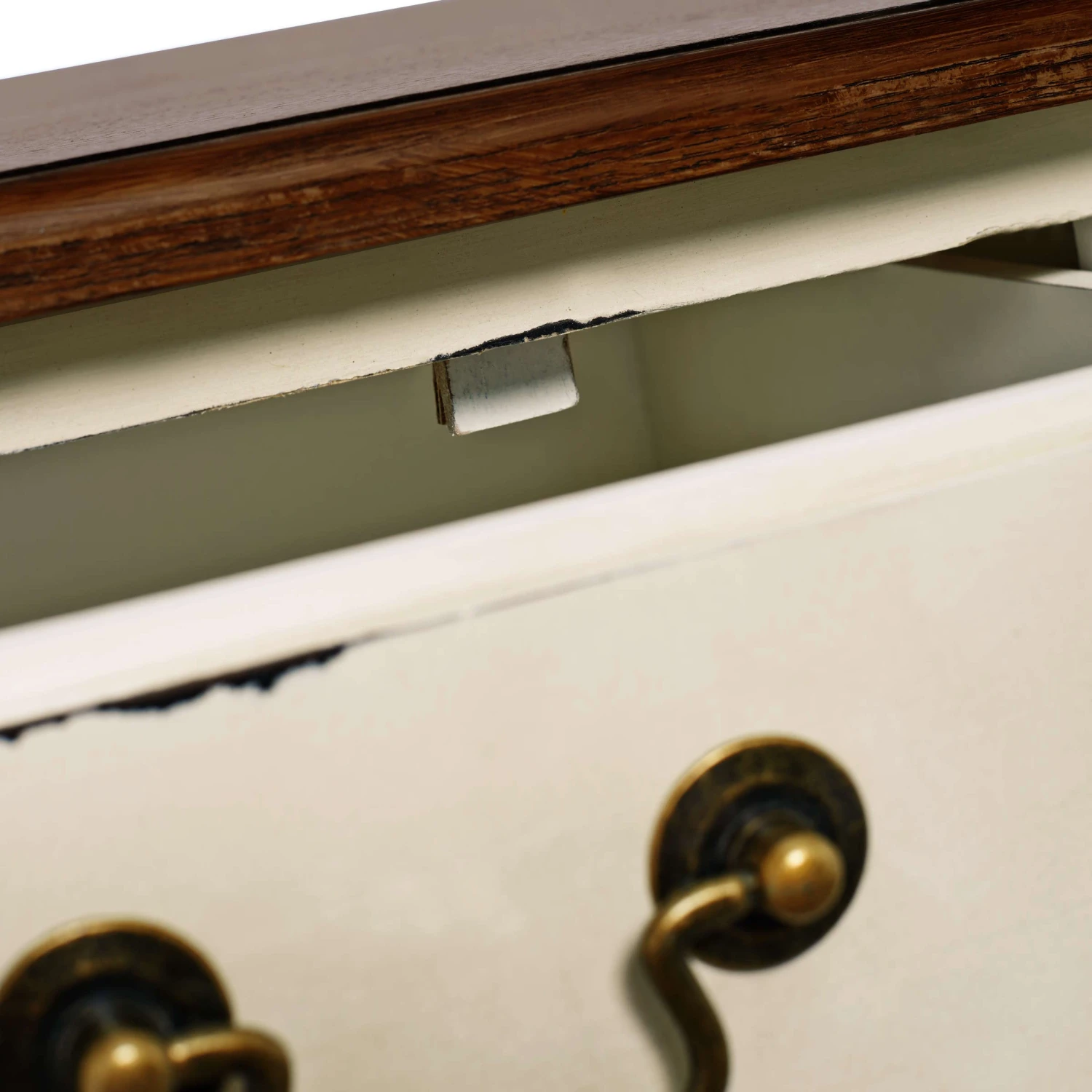 Ein verschlafener kleiner Ort irgendwo im Nirgendwo der USA. Ein Häuschen mit Schaukel auf der Veranda und Pick-up vor der Tür, mit Nancy und Bob als Nachbarn und einem Drugstore an der Ecke. Genau aus dieser Welt könnten die Cabott Cove-Möbel stammen. Denn die Serie ist inspiriert vom amerikanischen Landhaus-Stil der 60er Jahre: Antik wirkendes Cremeweiß, hier und da mit brauner Esche kombiniert, messingfarbene Griffe, Kassetteneinsätze in Rillendekor und deutliche Vintage-Effekte – so heimelig kann Wohnen sein. Hier: Konsolentisch mit 3 Schubladen, eschefurnierte Platte.