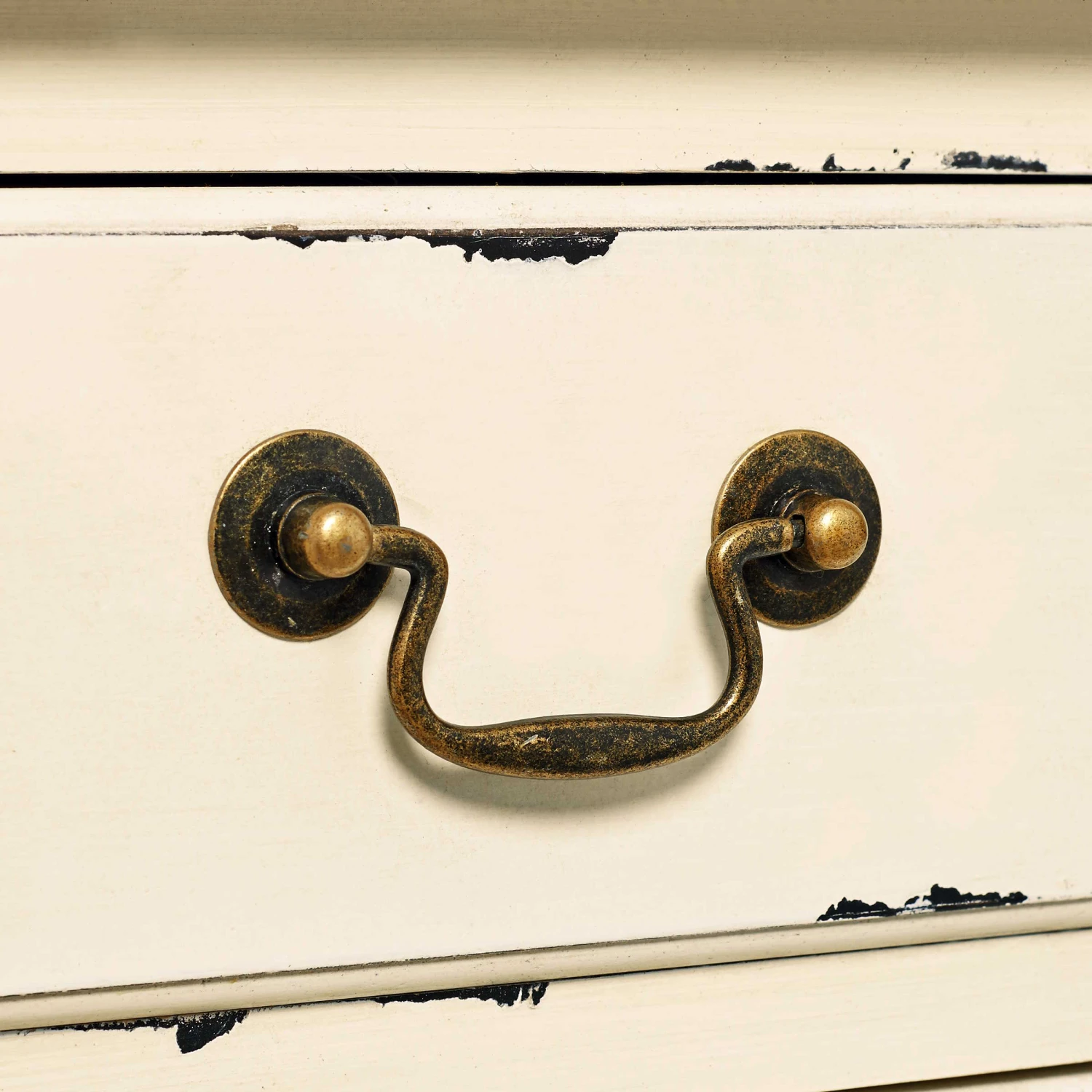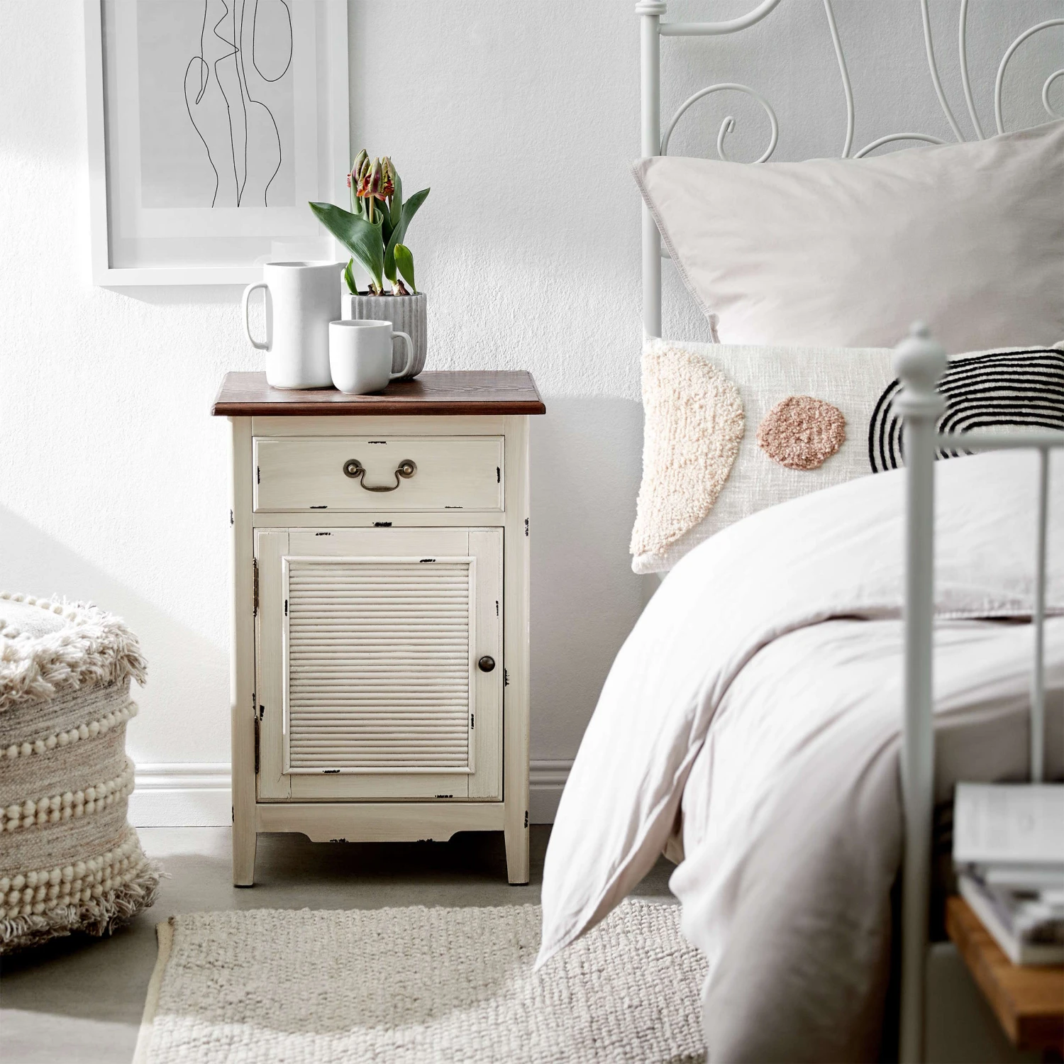Inspiriert vom amerikanischen Landhausstil der 60er Jahre: Der Cabotte Cove Nachttisch mit Schublade und Tür verbreitet mit seinem Used-Look familiäre Gemütlichkeit. Farblich kombiniert er Paulowniaholz und Eschenholz in Creme mit einer MDF-Platte in braunem Esche-Furnier. Passend dazu sind die Metallbeschläge im Vintagestil gehalten, und auch der Kassetteneinsatz im Rillendekor harmoniert perfekt. Alles ganz genau so, wie man es schon früher in den kleinen, verschlafenen Ort irgendwo im Nirgendwo der USA geliebt hat. Zum Kombinieren sind weitere Möbelstücke aus der Cabotte Cove Serie erhältlich.