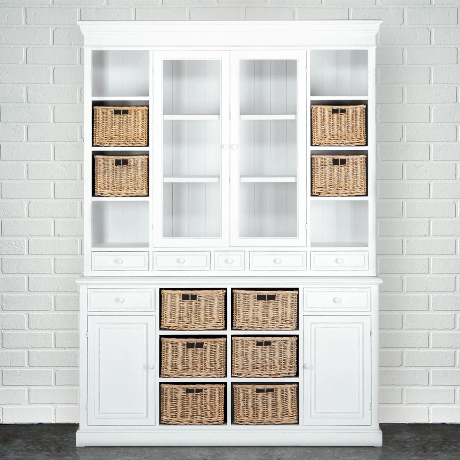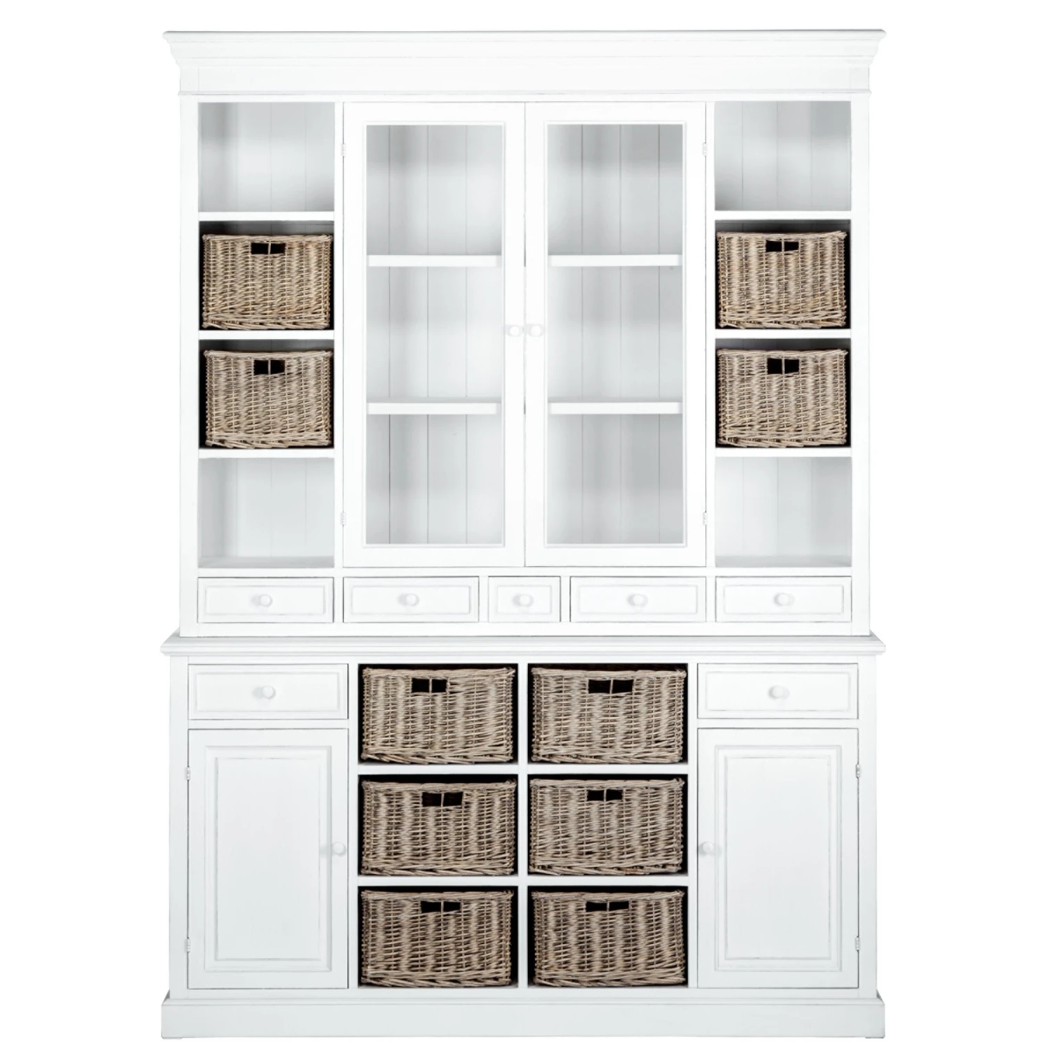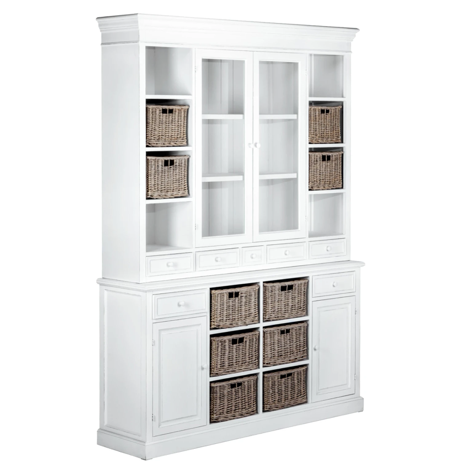 Den unbeschwerten Zauber Südfrankreichs bringt Ihnen unsere Campagne-Serie ins Haus. Zu dieser gehört auch unser hochwertiger Wohnschrank im zeitlosen Design, der sich durch hohe Funktionalität und viel Stauraum auszeichnet. Er eignet sich ideal für die Wohnküche oder das Esszimmer und besteht aus zwei Teilen: Unten bieten zwei Schubladen, zwei Türen und sechs handgeflochtene Rattankörbe reichlich Platz für Ihre Habseligkeiten. Im oberen Teil kommen acht Fächer (vier davon mit handgeflochtenen Rattankörben), zwei Glastüren (Sicherheitsglas) mit Magnetverschluss (dahinter zwei Böden) und fünf kleine Schubladen dazu. Dadurch bietet er reichlich Platz zum Verstauen und Dekorieren. Die hellen Campagne-Möbel und Wohnaccessoires im Landhausstil weisen kleine Gebrauchsspuren auf – fast so als wären Sie Ihnen schon seit vielen Jahren ans Herz gewachsen. Diese und weitere Campagne-Möbel sind exklusiv bei BUTLERS erhältlich.