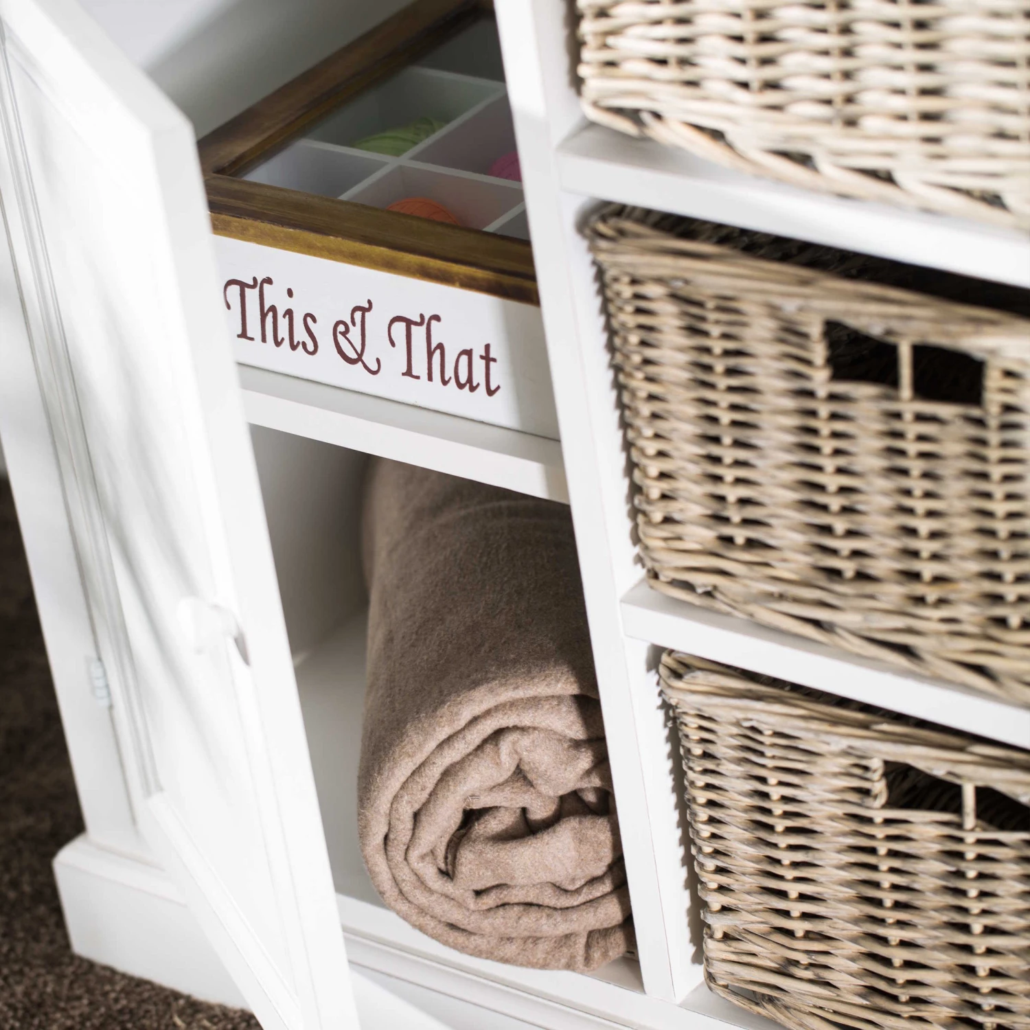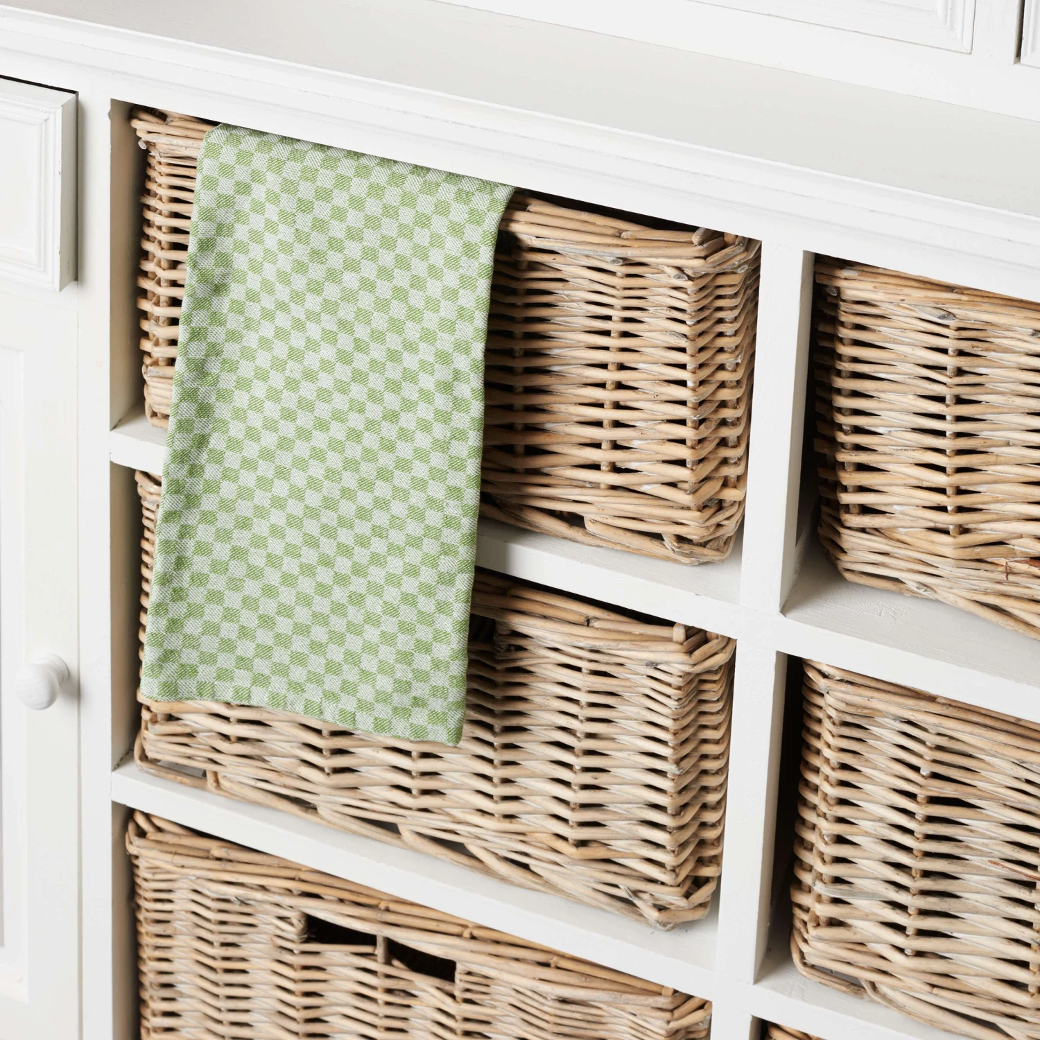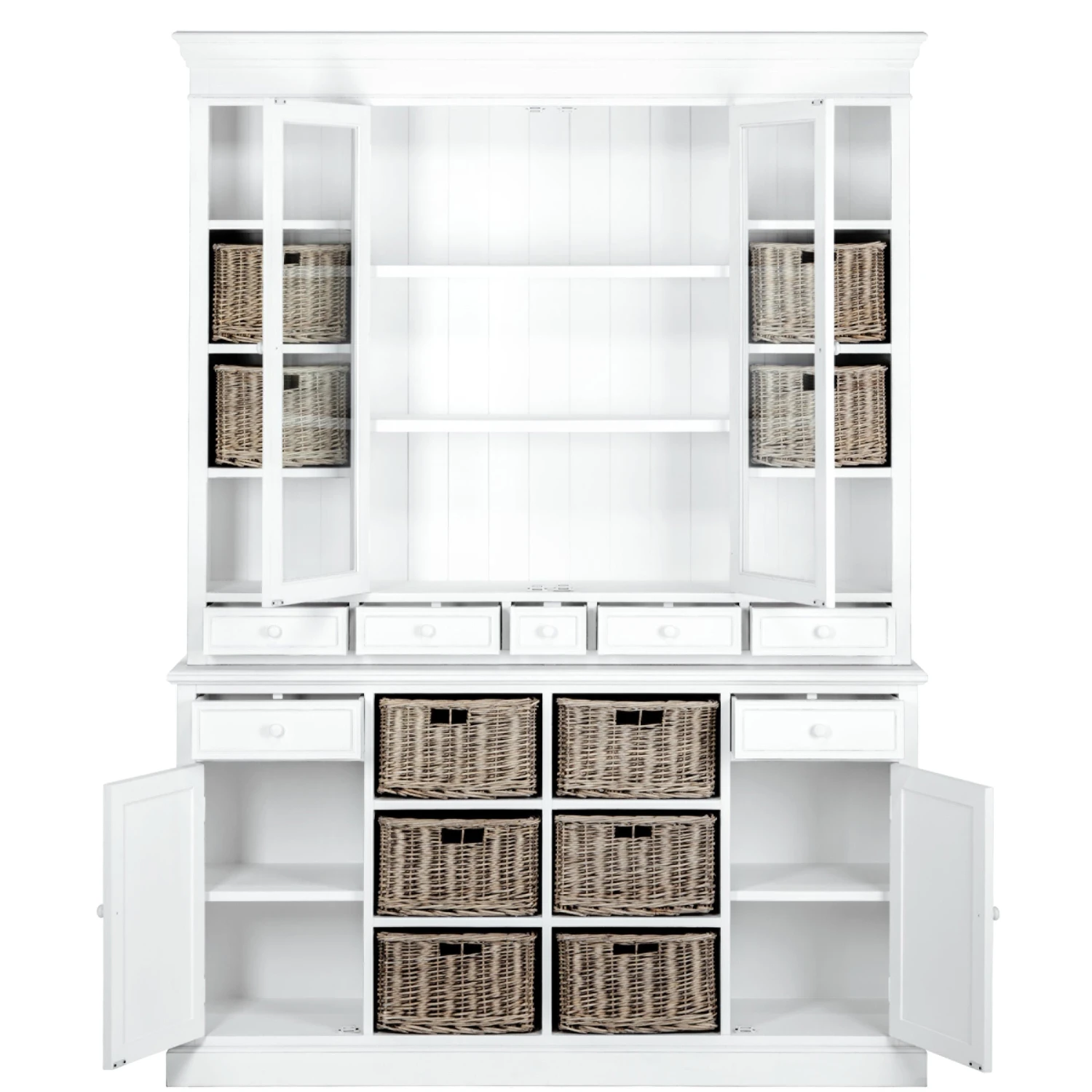Den unbeschwerten Zauber Südfrankreichs bringt Ihnen unsere Campagne-Serie ins Haus. Zu dieser gehört auch unser hochwertiger Wohnschrank im zeitlosen Design, der sich durch hohe Funktionalität und viel Stauraum auszeichnet. Er eignet sich ideal für die Wohnküche oder das Esszimmer und besteht aus zwei Teilen: Unten bieten zwei Schubladen, zwei Türen und sechs handgeflochtene Rattankörbe reichlich Platz für Ihre Habseligkeiten. Im oberen Teil kommen acht Fächer (vier davon mit handgeflochtenen Rattankörben), zwei Glastüren (Sicherheitsglas) mit Magnetverschluss (dahinter zwei Böden) und fünf kleine Schubladen dazu. Dadurch bietet er reichlich Platz zum Verstauen und Dekorieren. Die hellen Campagne-Möbel und Wohnaccessoires im Landhausstil weisen kleine Gebrauchsspuren auf – fast so als wären Sie Ihnen schon seit vielen Jahren ans Herz gewachsen. Diese und weitere Campagne-Möbel sind exklusiv bei BUTLERS erhältlich.