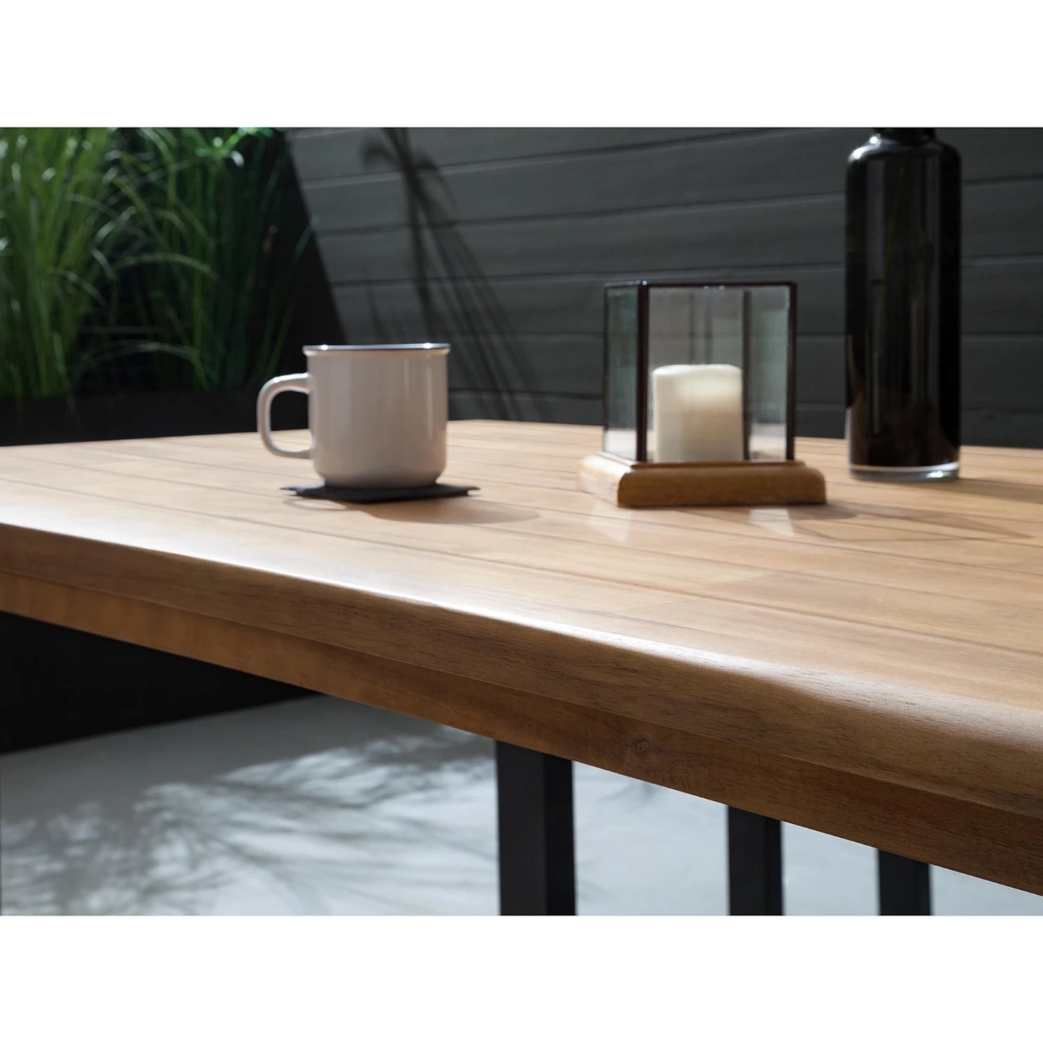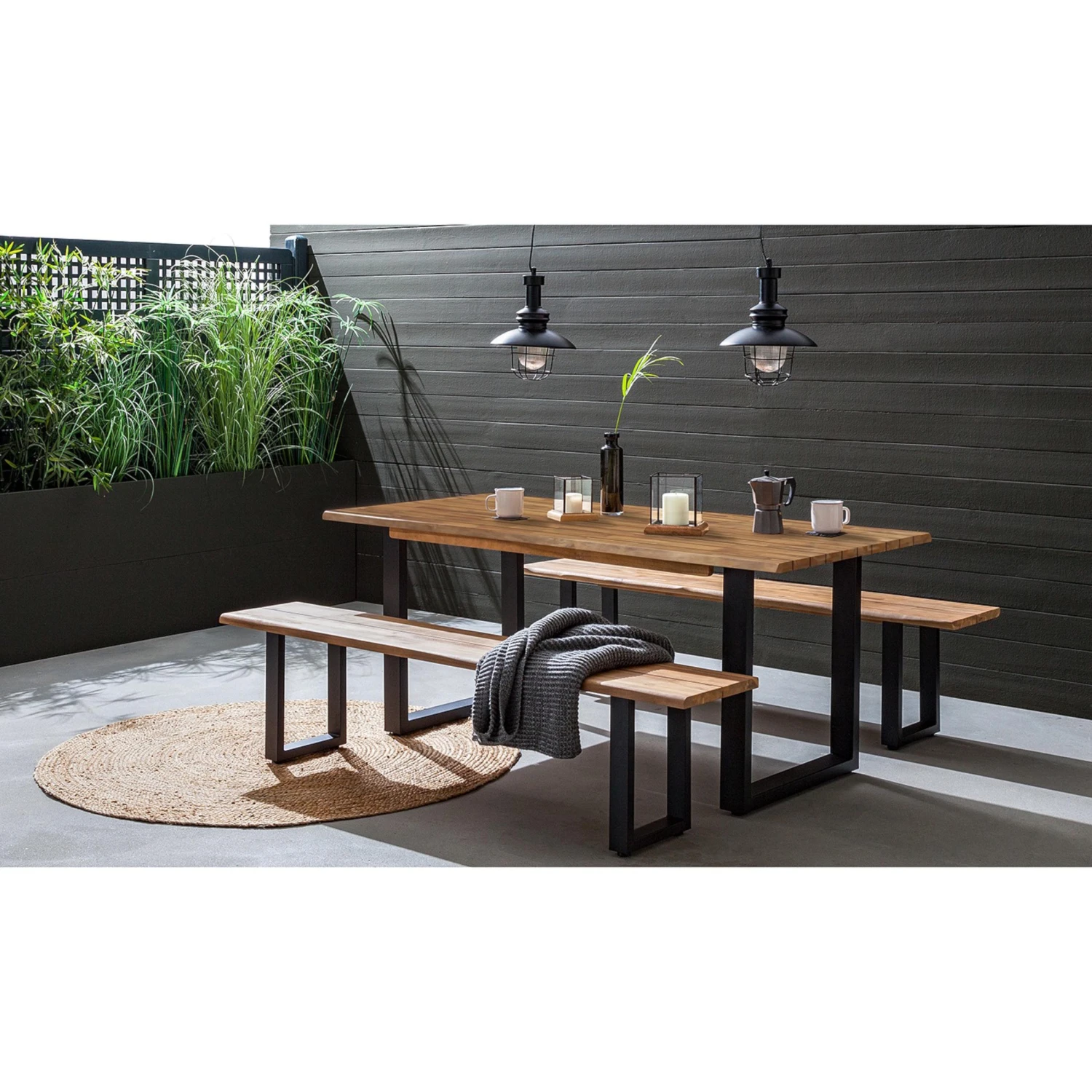 Clean, modern oder industrial sind genau Ihr Style? Dann passt der Edgewood Gartentisch perfekt auf Ihren großen Balkon oder Ihre Terrasse. Seinen besonderen Charakter verdankt der Tisch den Kufen aus schwarzem Eisen und der Platte aus Akazienholz. Einzelne kleine Holzleisten wurden hierfür zu großen langen Leisten verleimt, wodurch eine markante Musterung entsteht. Die längliche Tischkante ist zudem schräg abgeflacht und greift damit den Look einer Baumkante auf. Passende Gartenbank und 3-teilige Essgruppe mit Tisch und 2 Bänken erhältlich.