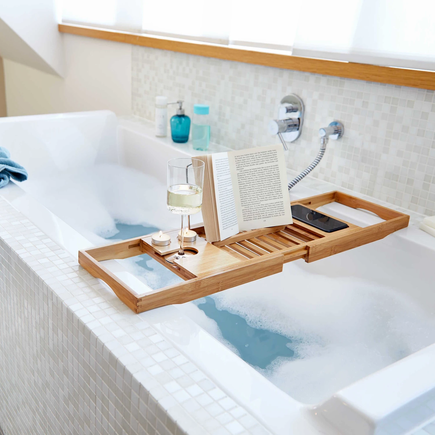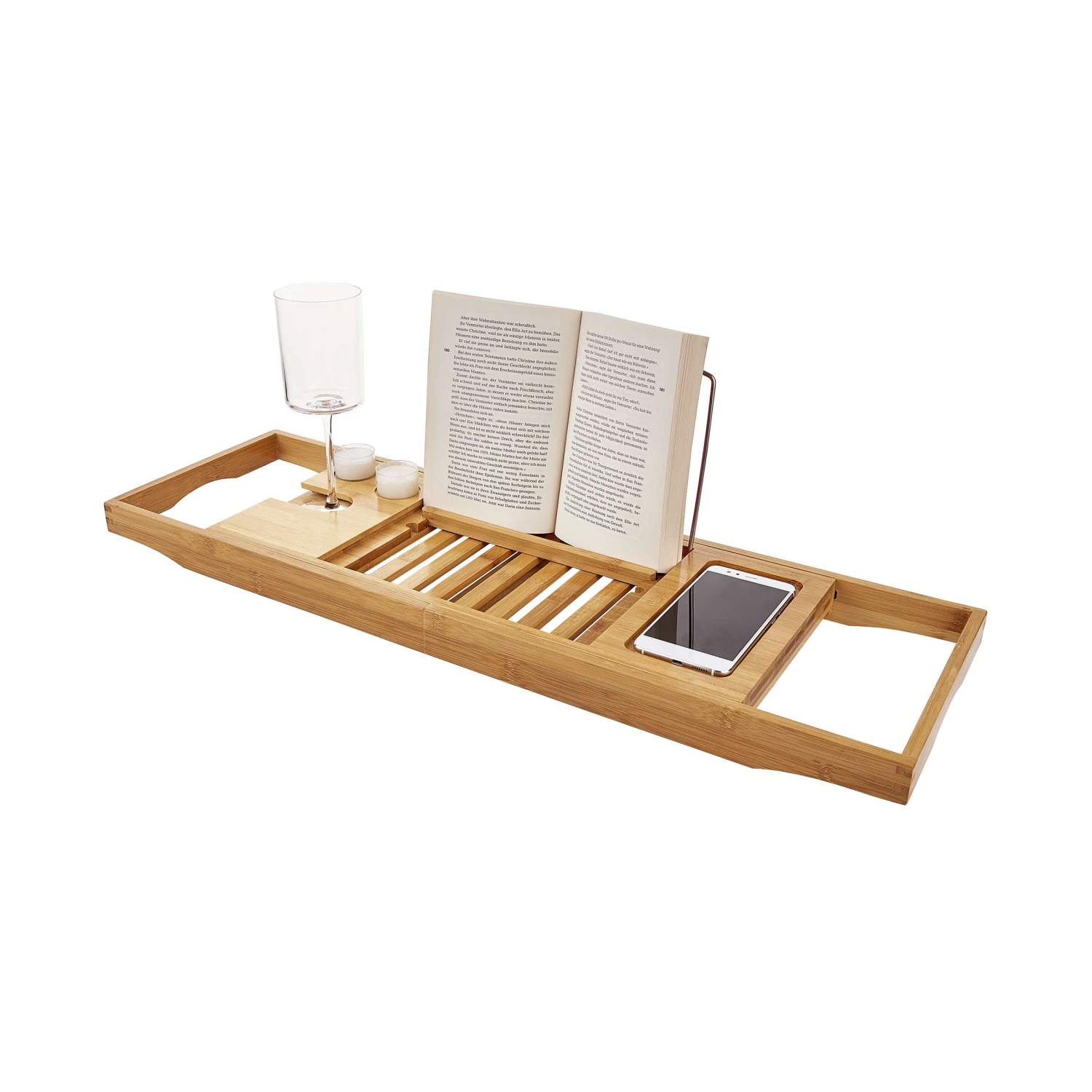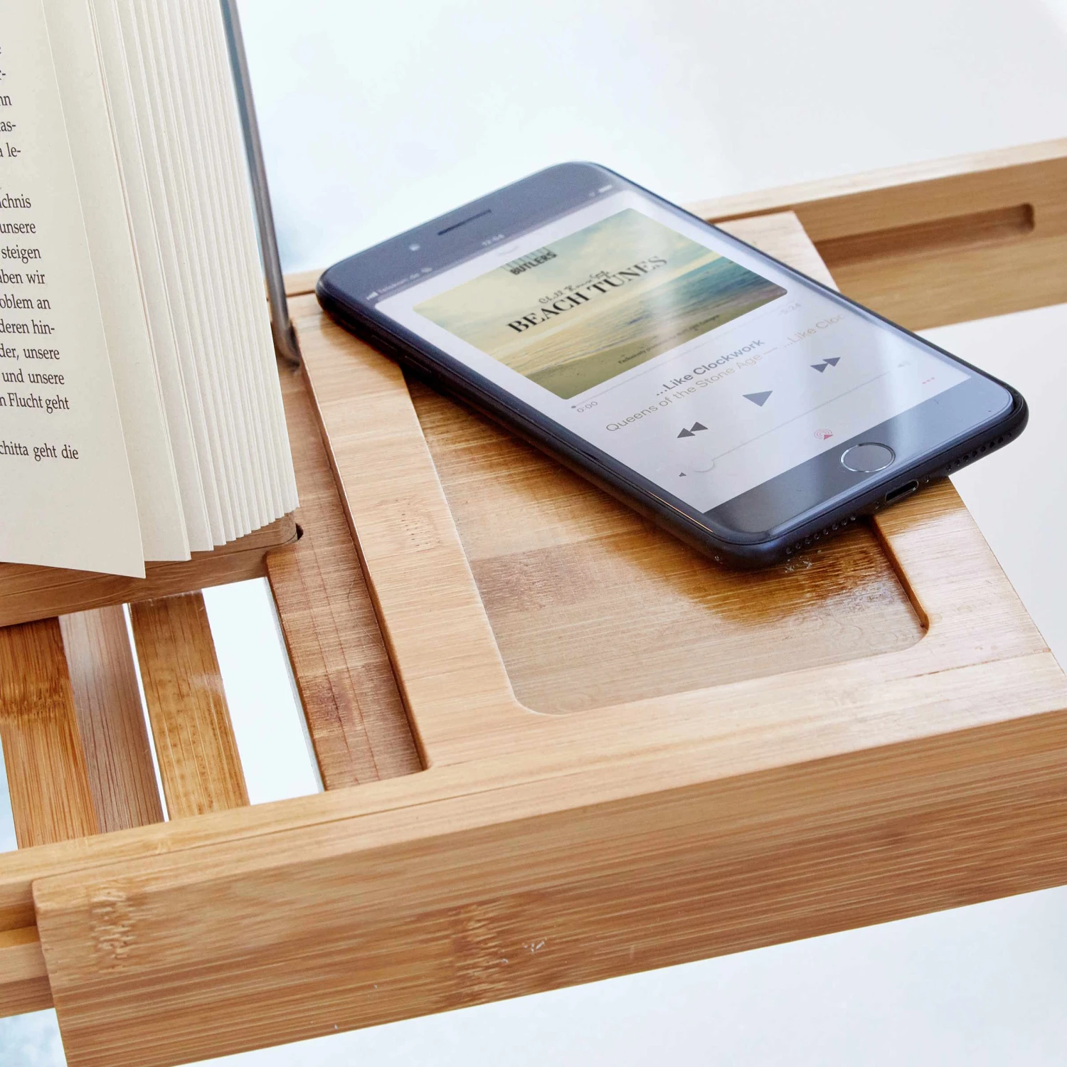 Erleben Sie Ihr ganz persönliches Wellnessprogramm für Zuhause. Mit der Feels Like Heaven Badewannenablage aus Bambusholz steht einem entspannten Bad nichts mehr im Wege. Die ausziehbare Holzablage bietet ausreichend Platz für Ihre Wohlfühlartikel, wie ein prickelndes Glas Champagner oder Ihr Lieblingsbuch. Aber auch ein Tablet findet Platz auf der exklusiven Badewannenablage mit Buchstütze, sodass Sie sogar Ihre Lieblingsserie in der Badewanne weiterschauen können. So lässt es sich leben.