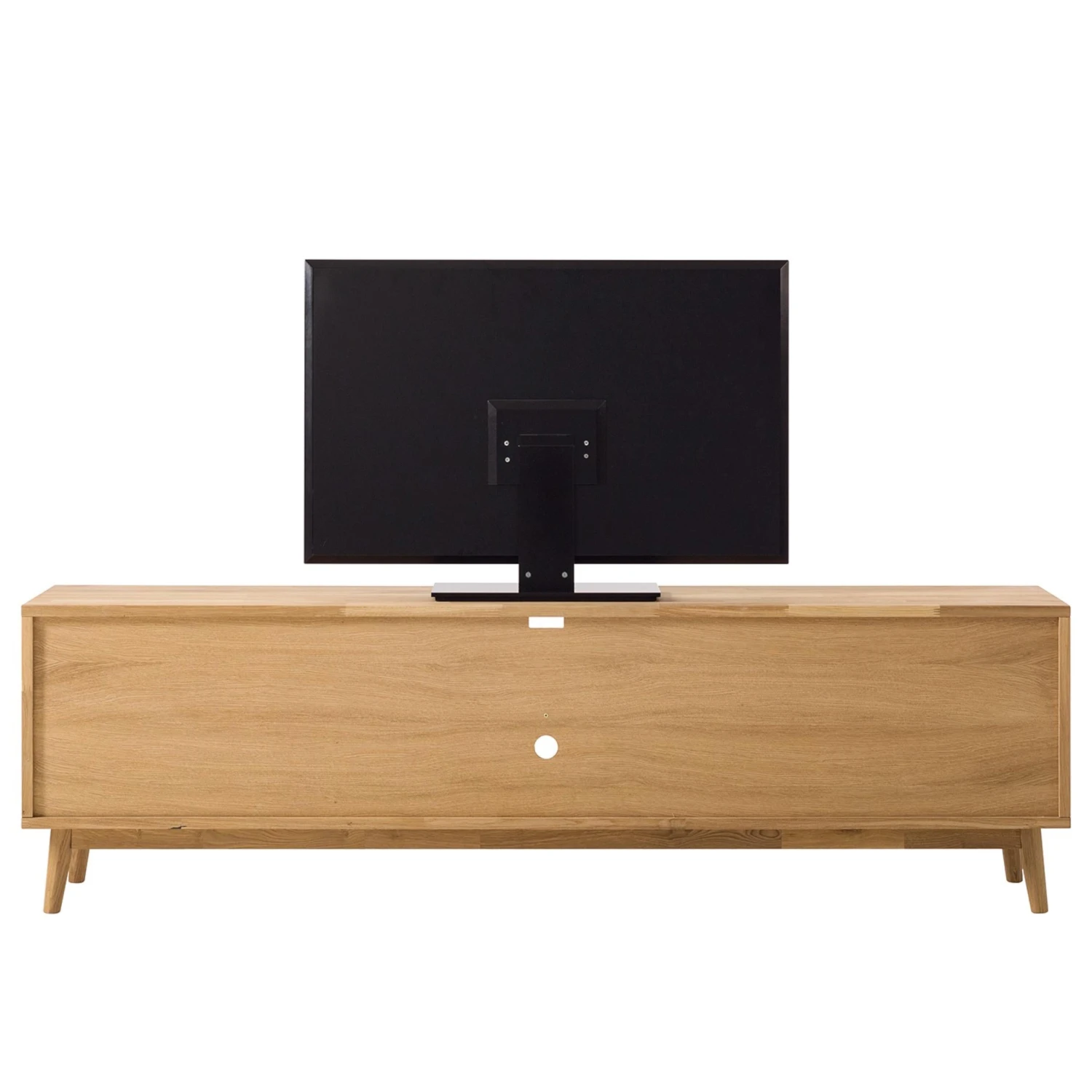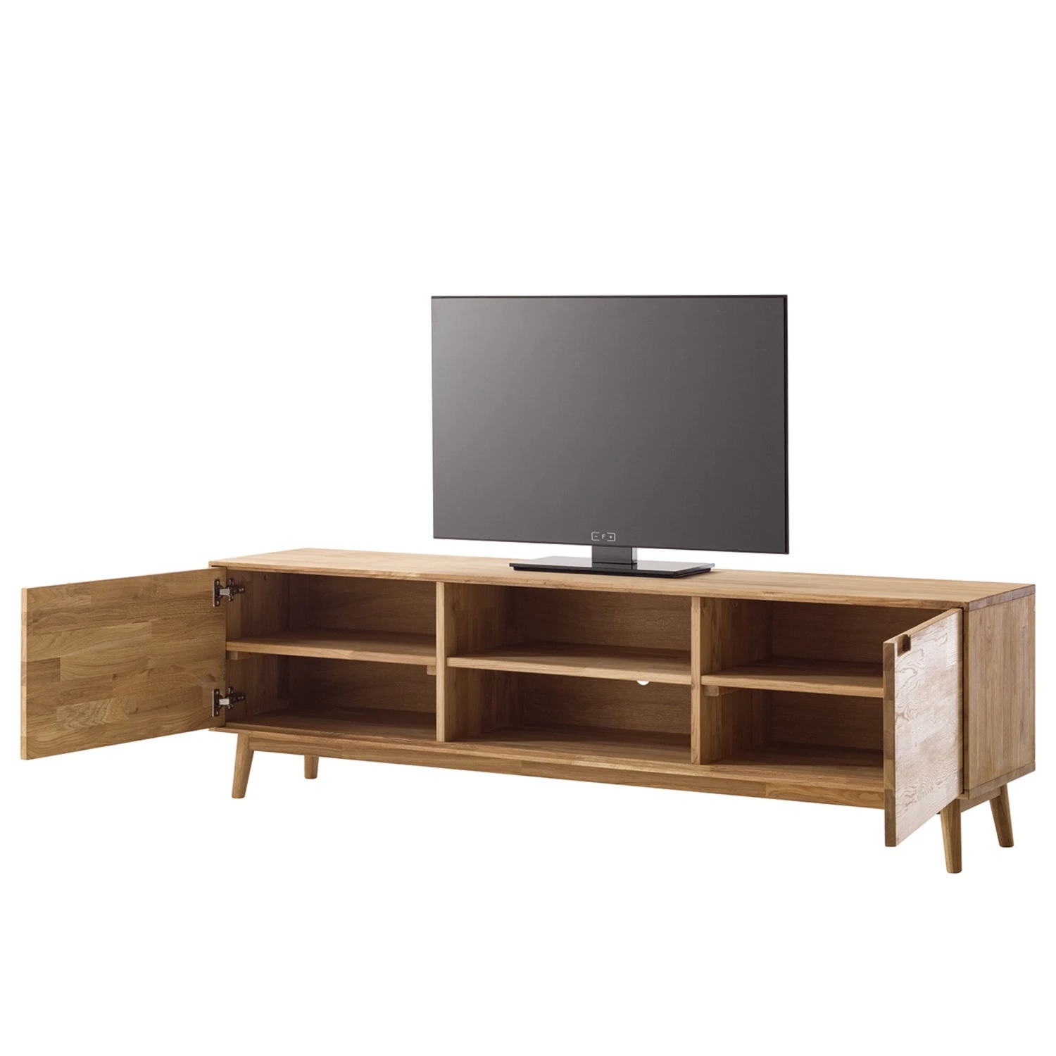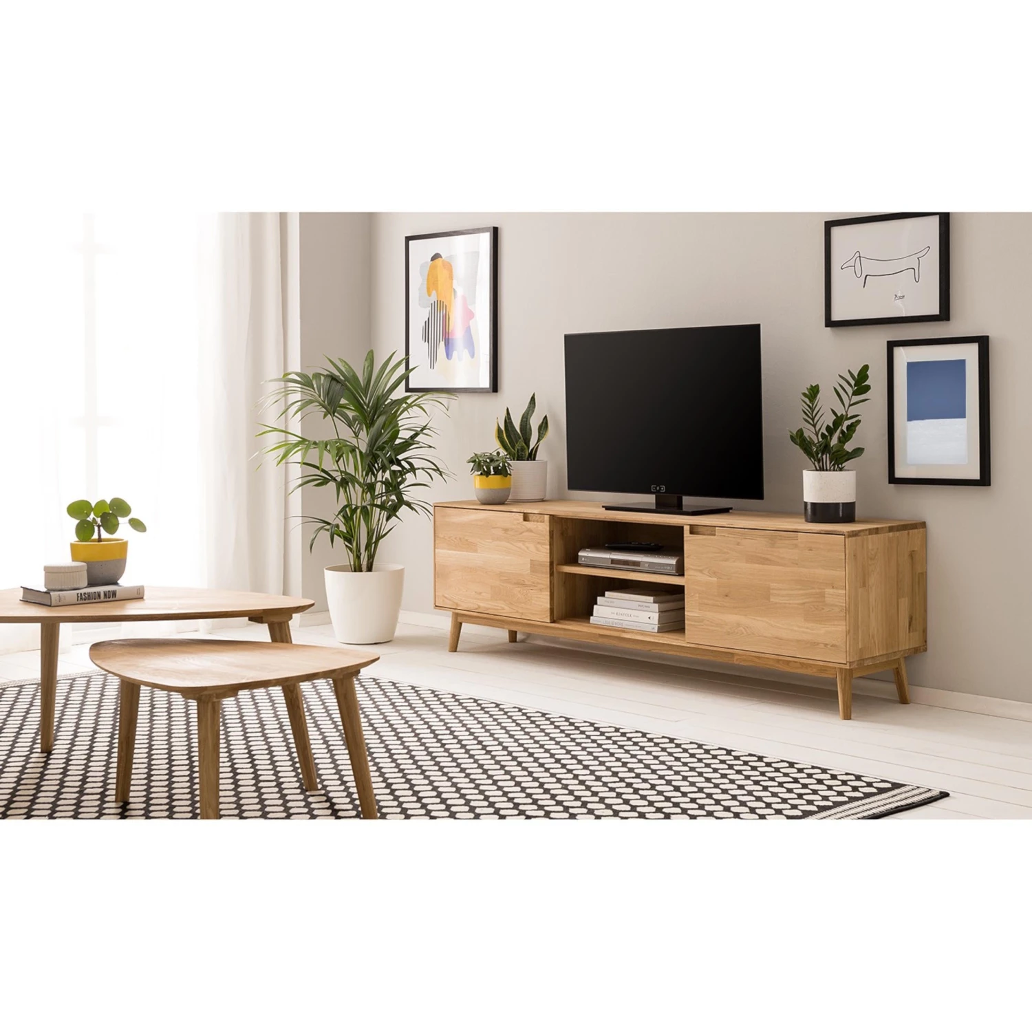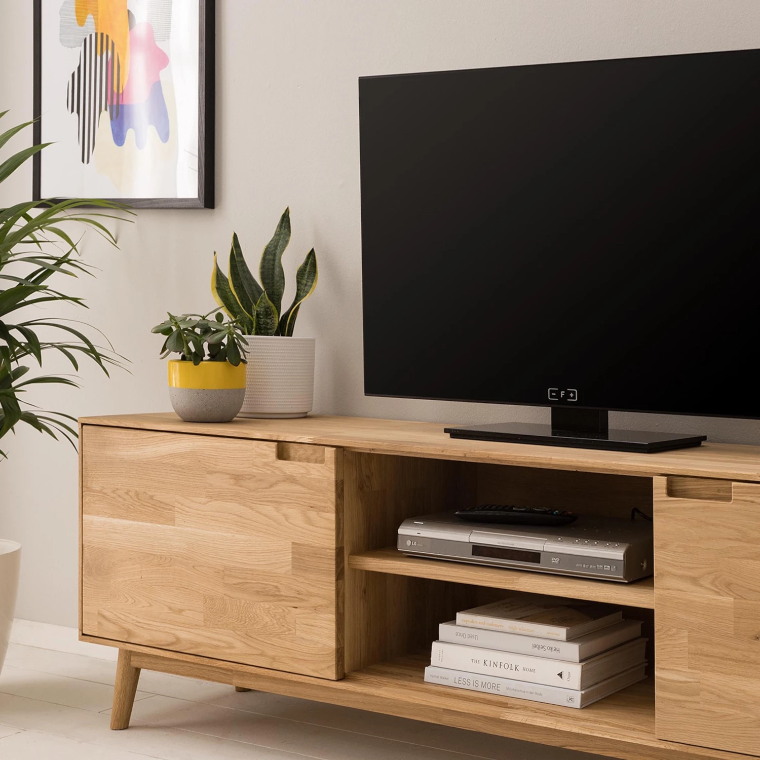 Das stilvolle TV-Lowboard aus der Serie Finsby wurde im skandinavischen Design aus massiver Buche gefertigt. Durch seine lebendige Holzmaserung erhält das Möbel einen natürlichen Look. Jede Menge Stauraum verbirgt sich hinter zwei Holztüren und in den zwei offenen Gerätefächern. Das Möbel sieht durch seine geölte Buche nicht nur schön aus, sondern es sorgt dafür, dass Ordnung in die Fernsehlandschaft gebracht wird. An der Rückwand des TV-Lowboards Finsby findet sich eine praktische Aussparung für die Kabeldurchführung.