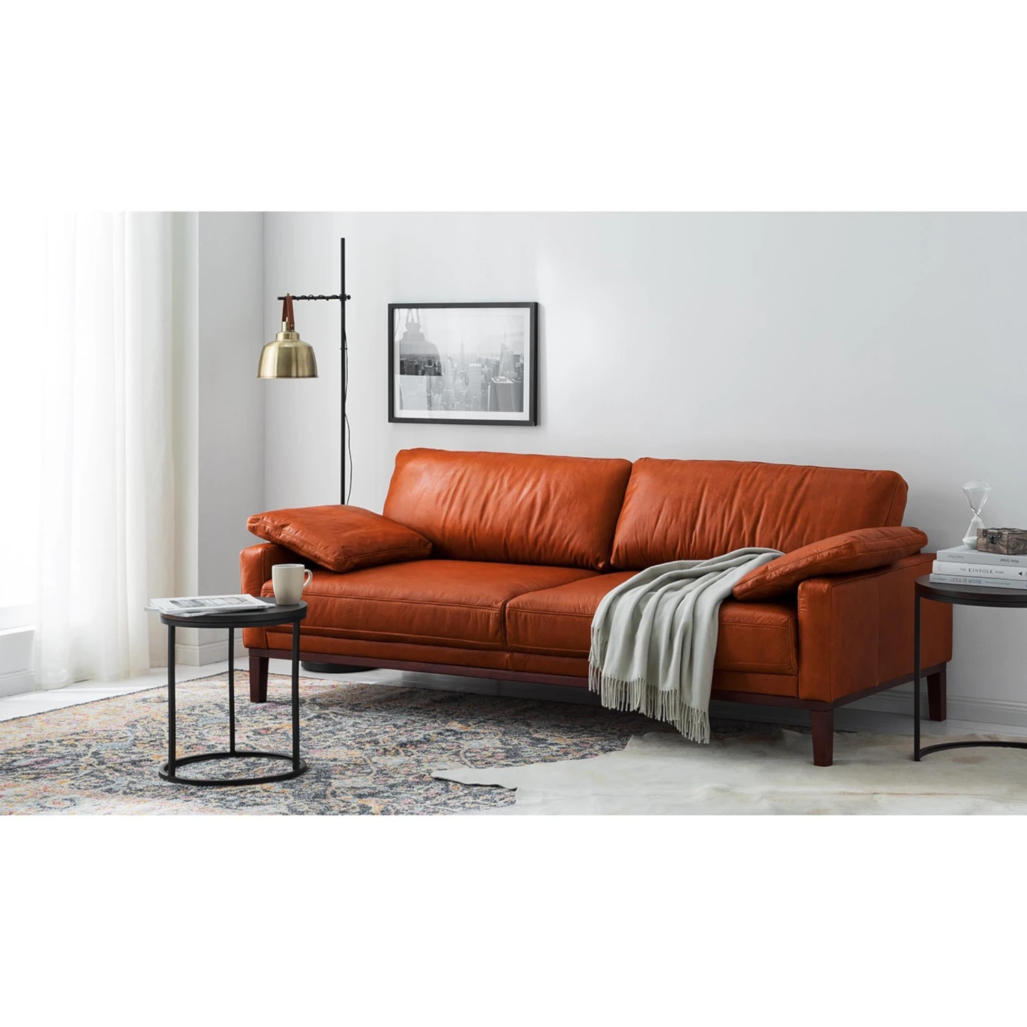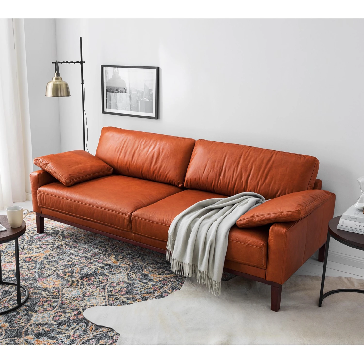 Das 3-Sitzer-Sofa Horley der Marke Ars Natura, ist ein schickes Sofa aus echtem, cognacfarbenen Büffelleder. Wengefarbene Füße aus Massivholz kombiniert mit der Lässigkeit des Lederbezugs sorgen für ein perfekt abgerundetes Bild. Die Polsterung ist aus hochwertigem Polyurethanschaumstoff gefertigt und somit äußerst bequem. Ein stabiles Holzuntergestell sorgen für eine lange Lebensdauer. Die Oberfläche des Sofas Horley ist gewachst aber ansonsten naturbelassen, wodurch das Möbelstück an Charakter gewinnt. Durch seinen Rundumbezug ist das Sofa im Raum beliebig stellbar. Echtleder benötigt eine besondere Pflege um möglichst lange schön und intakt zu bleiben, das Sofa darf somit nur mit speziellem Fleckenschutz behandelt werden.