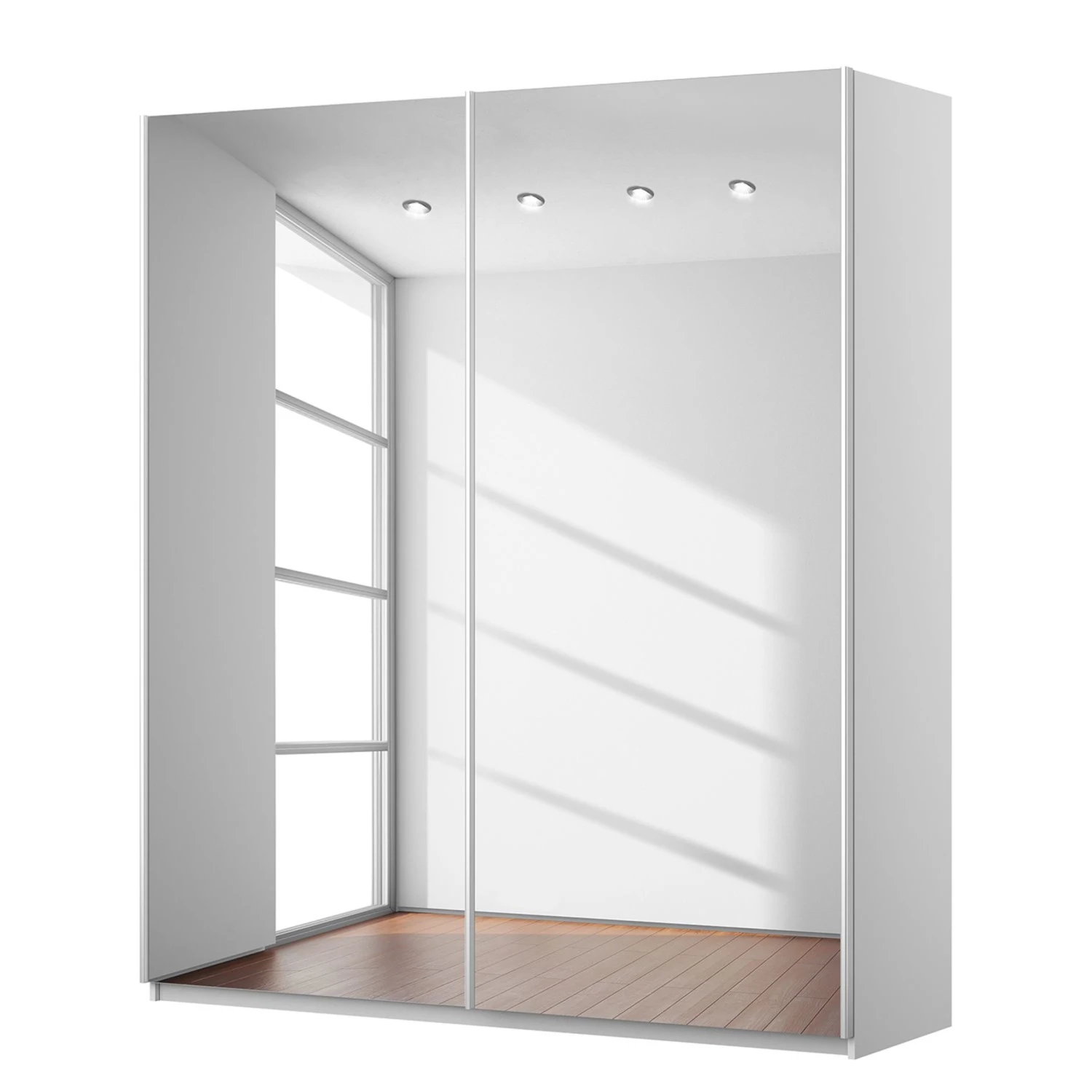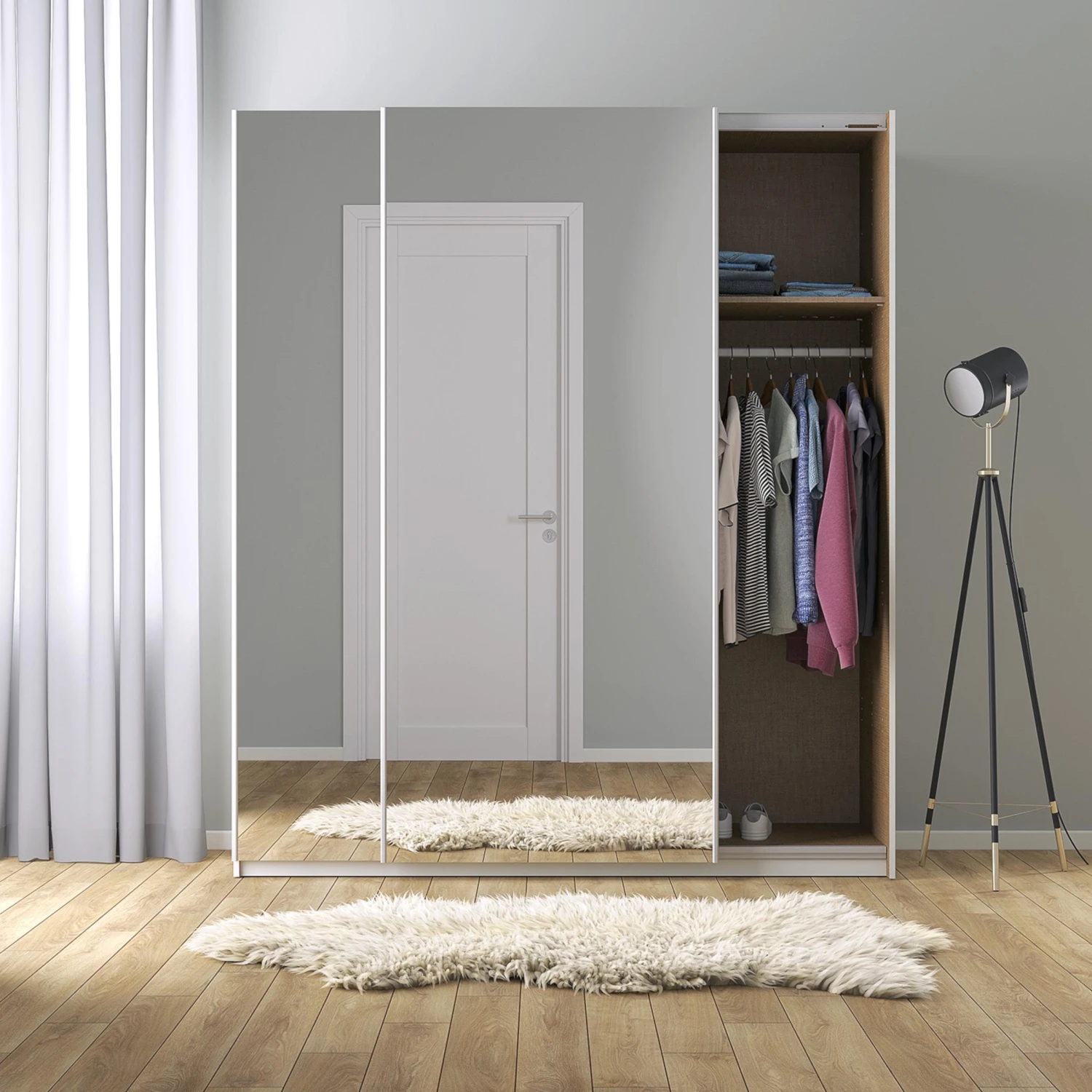 Ideal fürs Landhaus-Schlafzimmer ist dieser praktische Kleiderschrank, der einen rein weißen Korpus mit hochwertigen Spiegeltüren vereint. Diese lassen das Schlafzimmer größer und heller wirken und sind zudem auch ideal, um einen prüfenden Blick auf das Outfit zu werfen. Das geräumige Schrankinnere ist im naturfarbenen Leinen-Look gehalten und lässt sich mit diversem Zubehör praktisch organisieren.