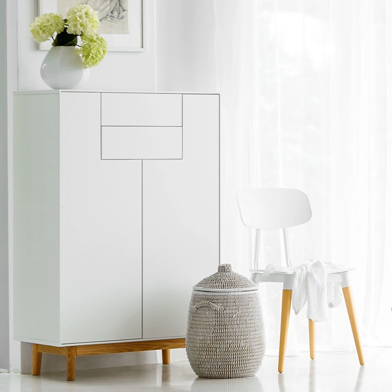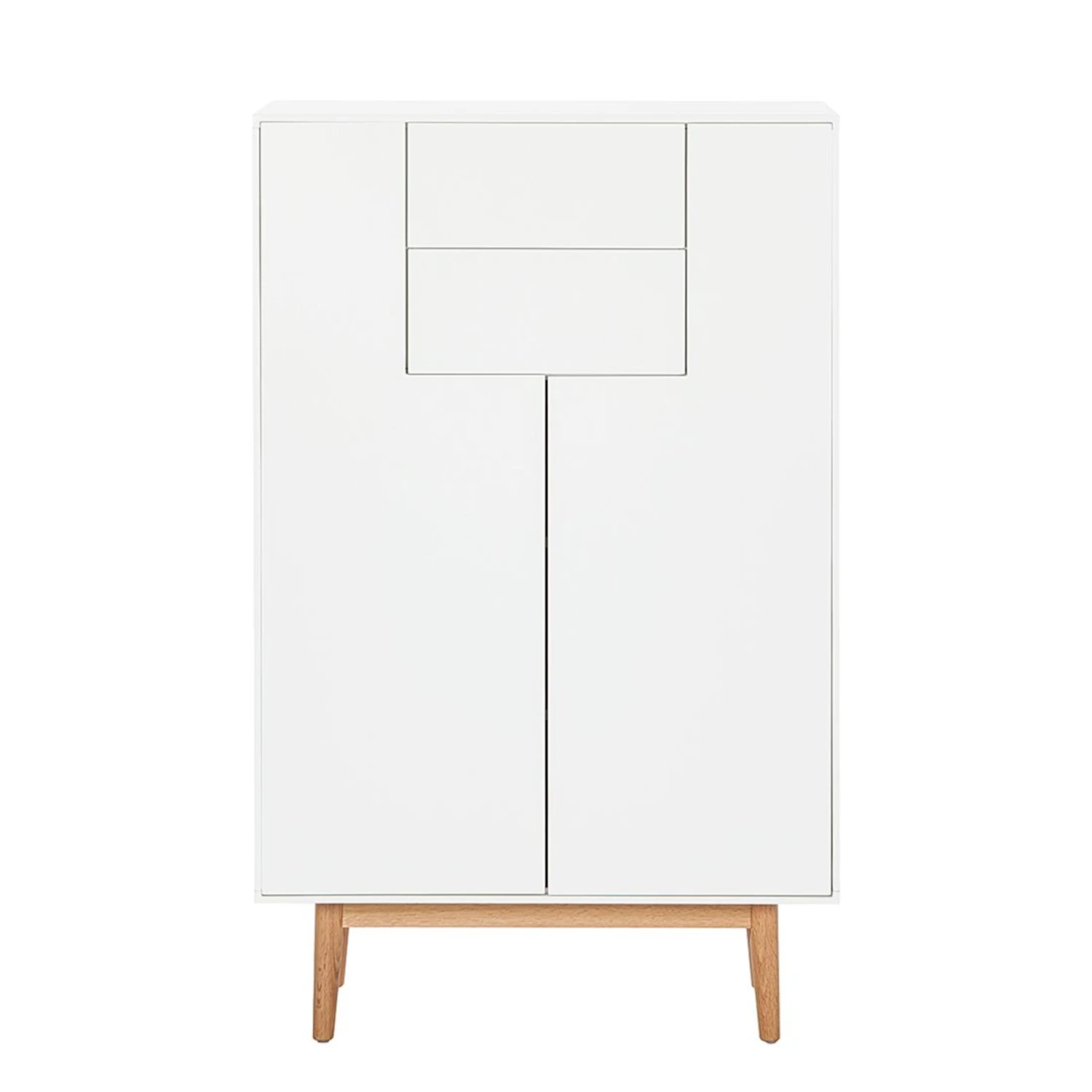 Dieses Highboard ist ein modernes Möbelstück, das im Design mit einem minimalistischen Look überzeugt. Dank der dezenten Geradlinigkeit und der aparten Formsprache integriert sich das weiße Möbelstück einwandfrei in jeden Wohnraum. Das reduzierte Design wird durch das filigrane Gestell aus massivem Eichenholz zusätzlich betont. Das Highboard sorgt mit jeder Menge Stauraum für ein aufgeräumtes Ambiente in Deinem Zuhause. Der schöne Blickfang bietet hinter zwei geschlossenen Türen und in zwei Schubladen jede Menge Platz für Deine Habseligkeiten. Dank der verstellbaren Einlegeböden findet auch Größeres in dem Highboard seinen Platz. Ein fast unsichtbares Highlight: Die Schubladen sind mit der smarten one-Touch-Funktion ausgestattet.