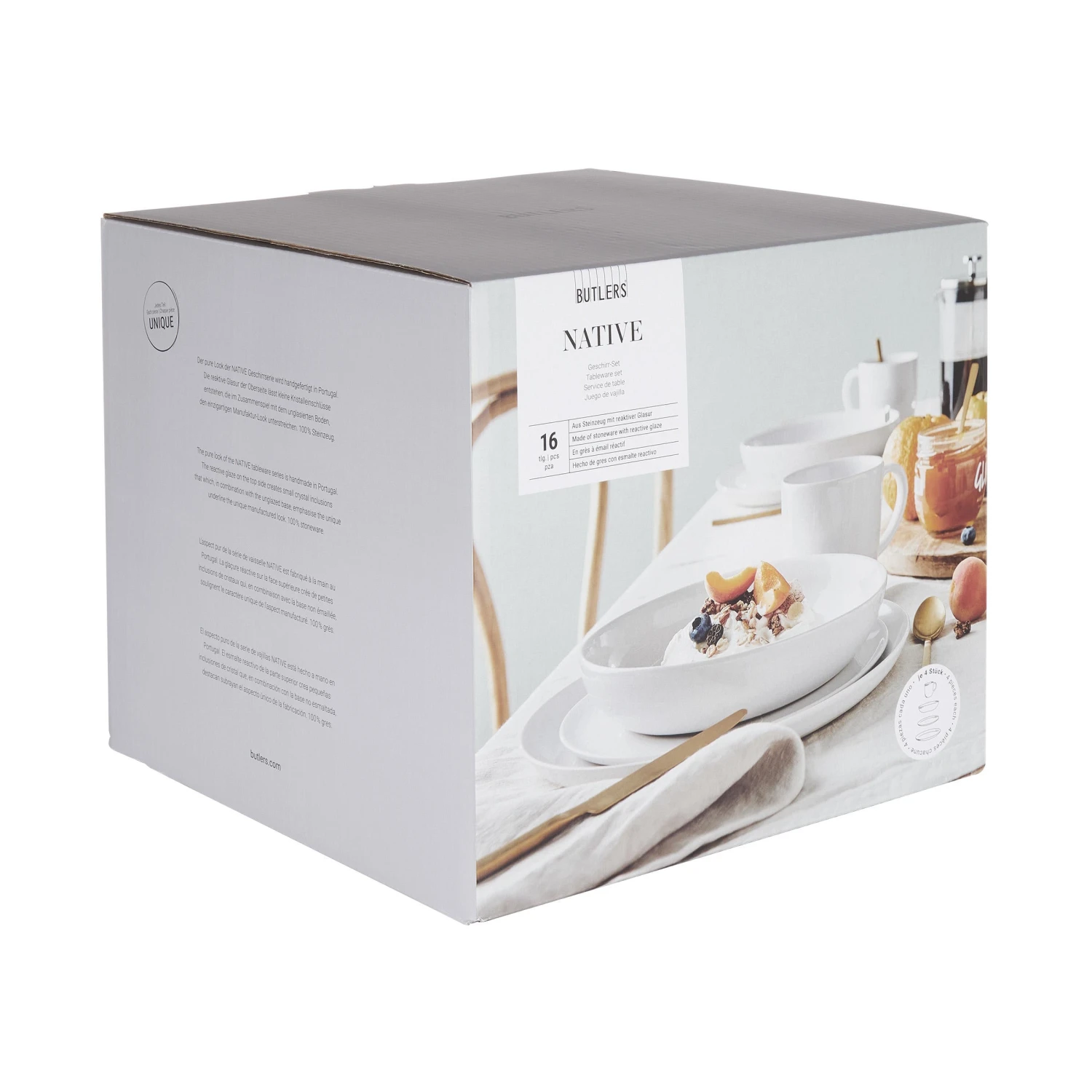 Mit unserer Geschirrserie Native im angesagten minimalistischen Design kommt der neue Trend auf den gedeckten Tisch! Das 16-tlg. Geschirr-Set aus Steinzeug in der Farbe Weiß ist handgefertigt in Portugal und hat eine dünne und hochwertige Scherbe mit einer klaren Formgebung. Durch die reaktive Glasur mit kleinen Kristalleinschlüssen wird jedes Teil der Serie zu einem echten Unikat. Der unglasierte Boden, der das Rohmaterial zum Vorschein bringt, sorgt für einen formvollendeten Manufaktur-Look. Jedes Teil der Serie ist spülmaschinen- und mikrowellengeeignet.