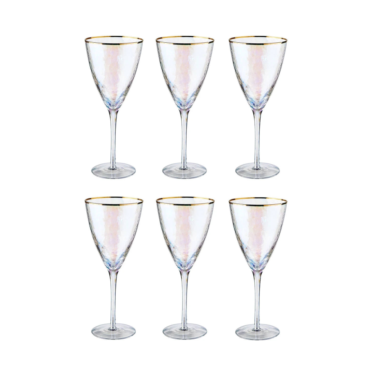 Wie die Perle einer Auster schillert auch das Smeralda Weinglas im 6er-Set mit Goldrand im zarten Perlmutt und weckt so echtes Fernweh nach Meer und Strand. Aber auch für den Urlaub zuhause ist das transparente Weinglas mit langem Stiel und leichter Oberflächenstruktur ein echter Hingucker. Kombiniert mit typischen maritimen Accessoires, wie Muscheln oder Deko-Fische und phantasievollem Geschirr holen Sie sich das Mittelmeer ganz einfach nach Hause. Zusammen mit den passenden Champagnerflöten und Wassergläsern ist der Strand-Look komplett.