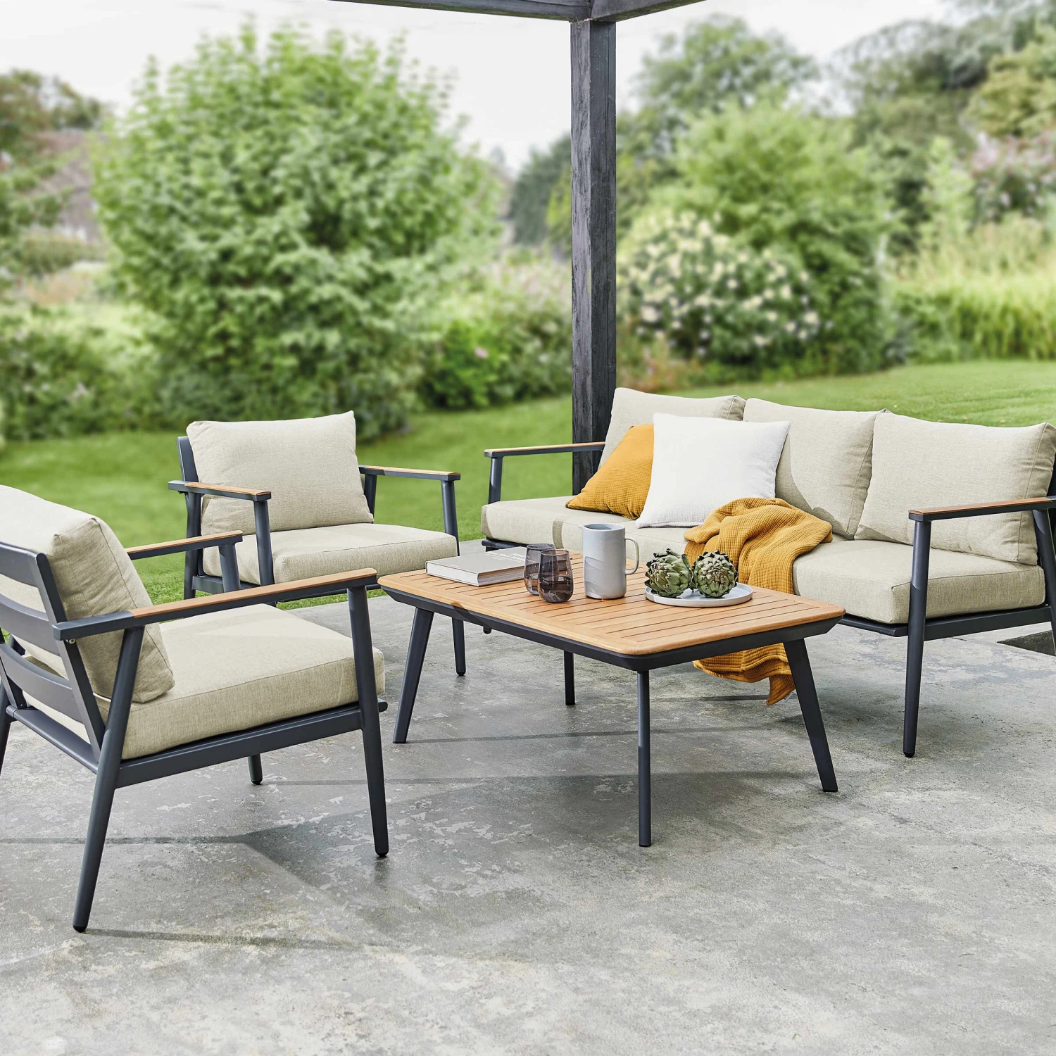 Sie verwandeln Ihre Terrasse oder Ihren größeren Balkon in eine stylische Outdoor-Lounge mit dem 4-teiligen Teak Time Lounge-Set. Bis zu 5 Personen finden hier Platz – und das ganz gemütlich mit allem Komfort. Dafür sorgen Armlehnen an Sofa und Sesseln, bequeme, wasserabweisende Kissen und der gut 110 cm lange Tisch mit Tischplatte aus FSC®-zertifiziertem Teakholz, auf dem Sie Getränke, Snacks und mehr bequem abstellen können. Optisch setzt das moderne Gartenmöbelset auf die zeitgemäße Kombination von Grau, Beige und Natur, da können Sie auf Wunsch mit zusätzlichen Kissen, Deko und Outdoor-Teppichen farbige Akzente setzen.