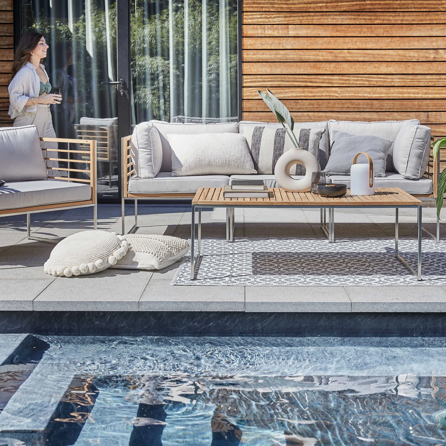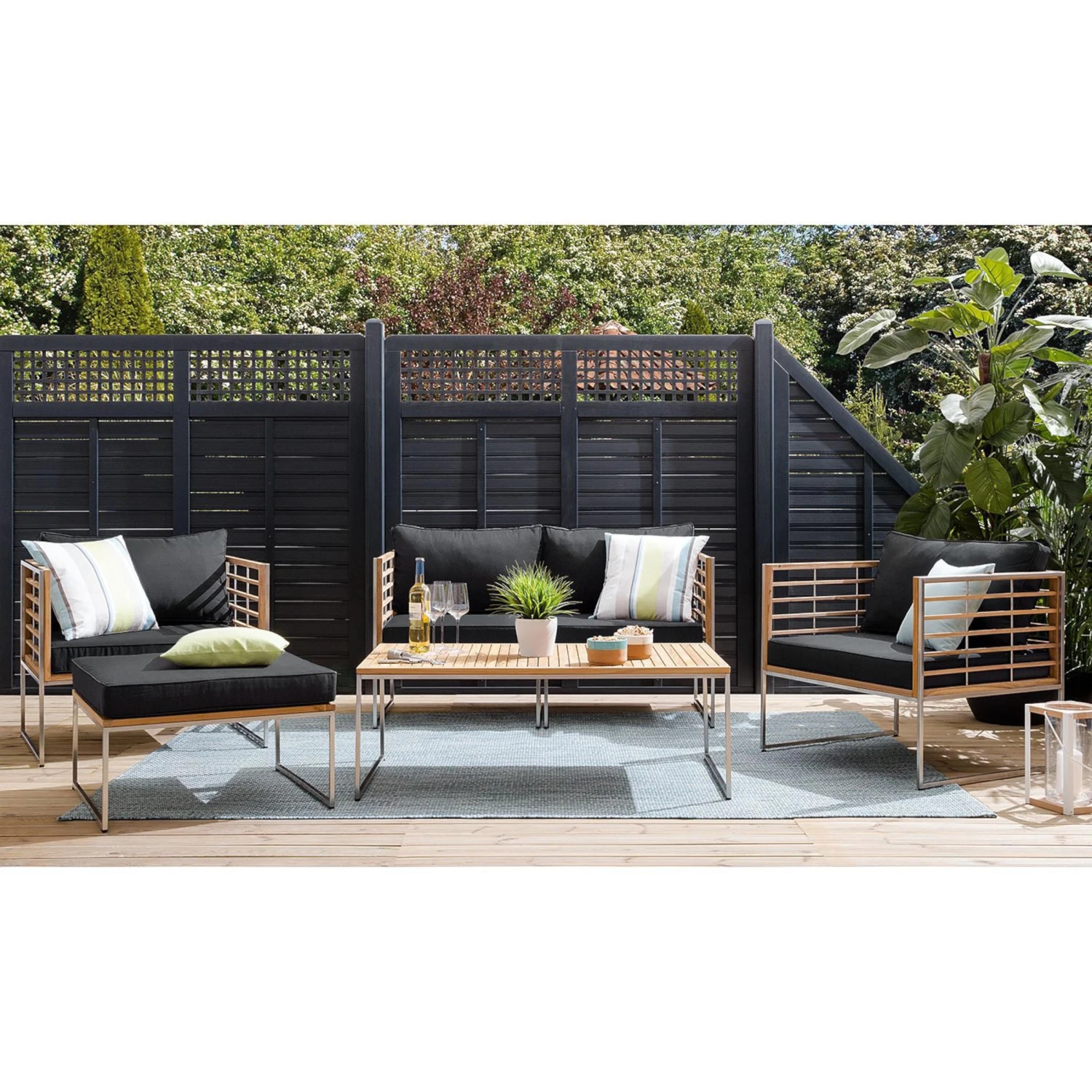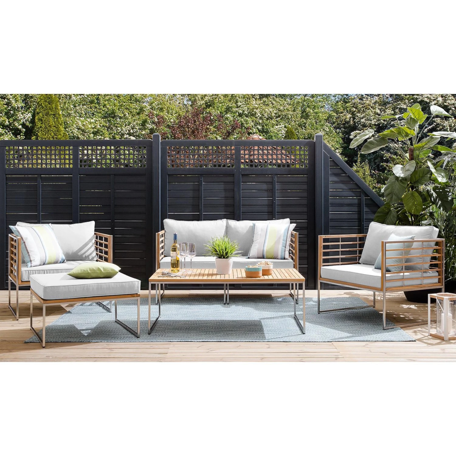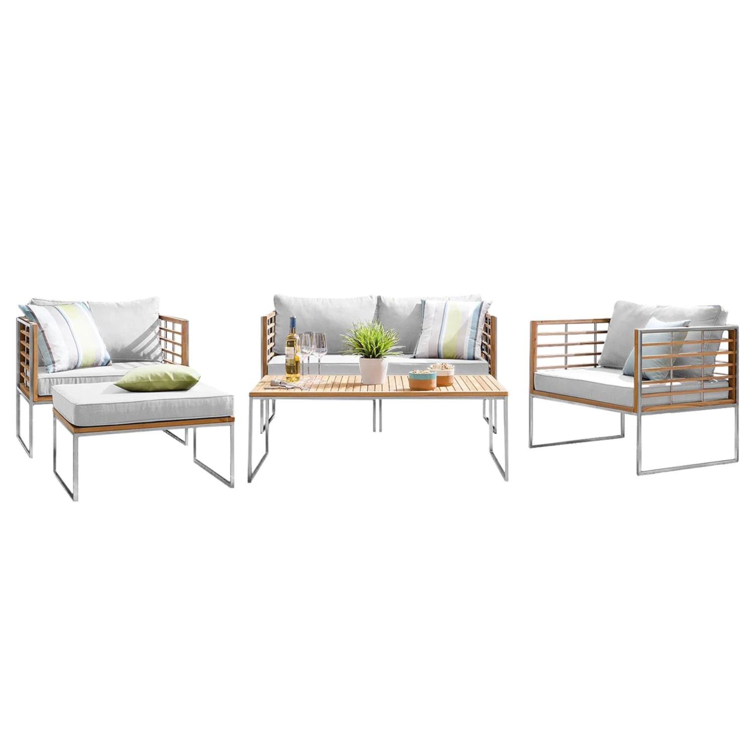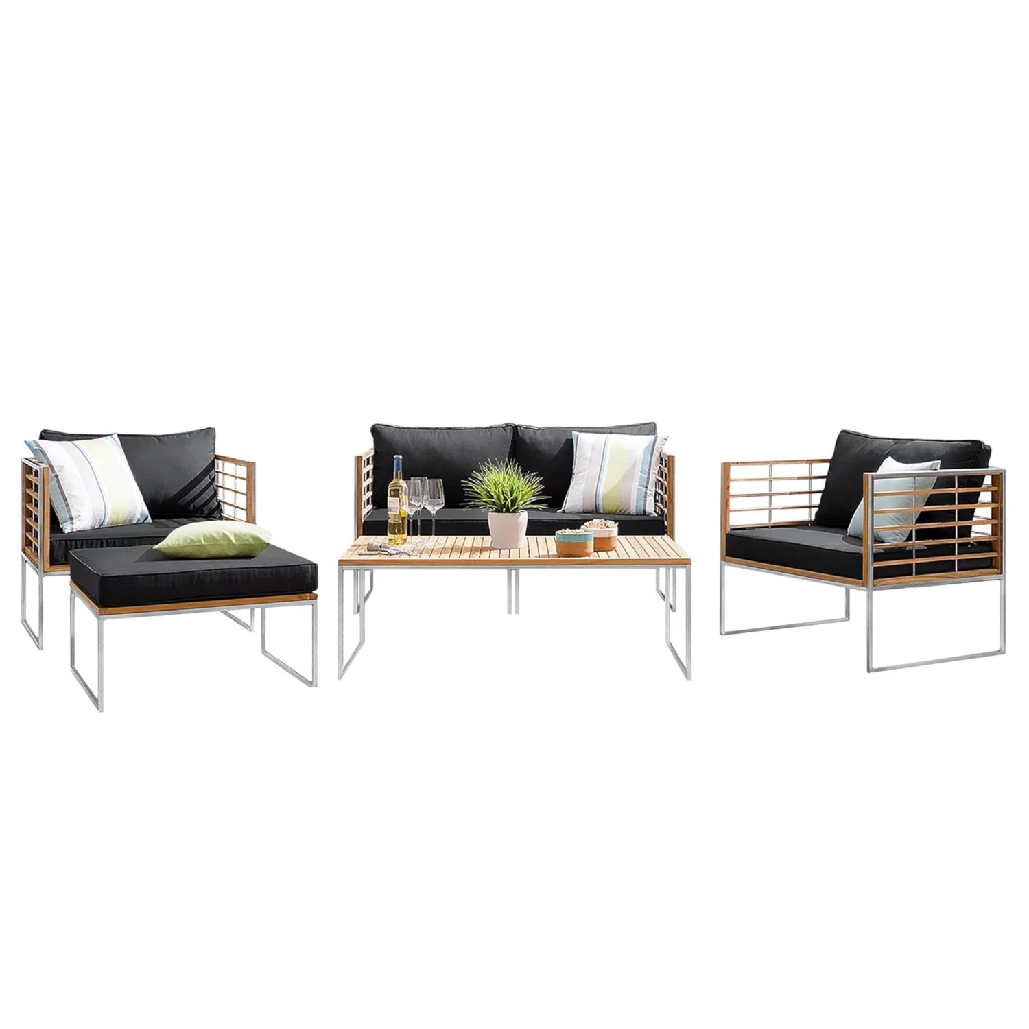 Dekotrends ändern sich, aber hochwertiges Design bleibt. In diesem Sinne ist bei der Teakline Gartenmöbel-Serie alles darauf ausgelegt, Ihren Balkon oder Ihre Terrasse über viele Jahre hinweg zu verschönern. So prägen klare Formen das Teakline Loungeset, und als wertige Materialien kommen massives Teakholz und rostfreier, gebürsteter Edelstahl zum Einsatz. In der Kombination ergeben sie einen spannenden Kontrast und versprechen bei entsprechender Pflege langanhaltende Schönheit und Haltbarkeit. Da braucht es nur noch wenige Accessoires wie Kissen, Windlichter und Laternen, um Dekotrends nach Lust und Laune in Szene zu setzen. In zwei Farbvarianten erhältlich.