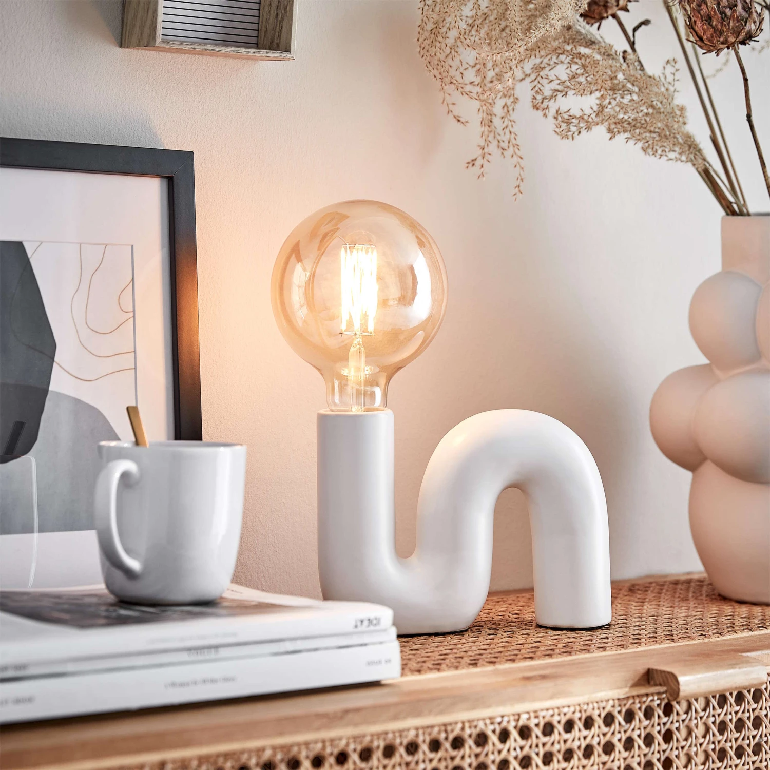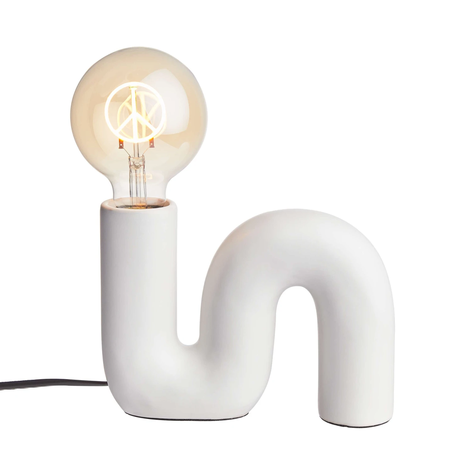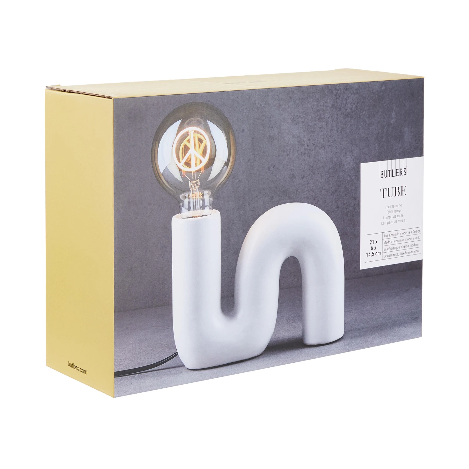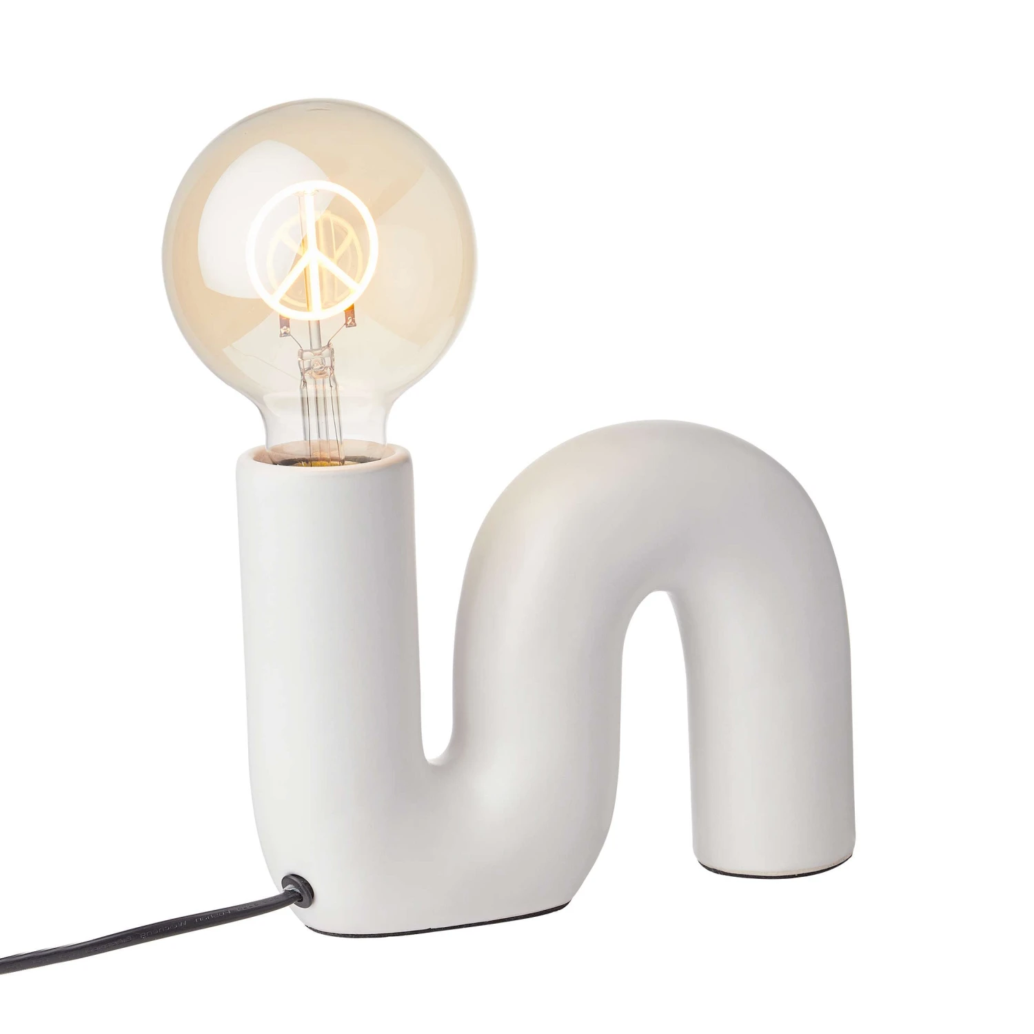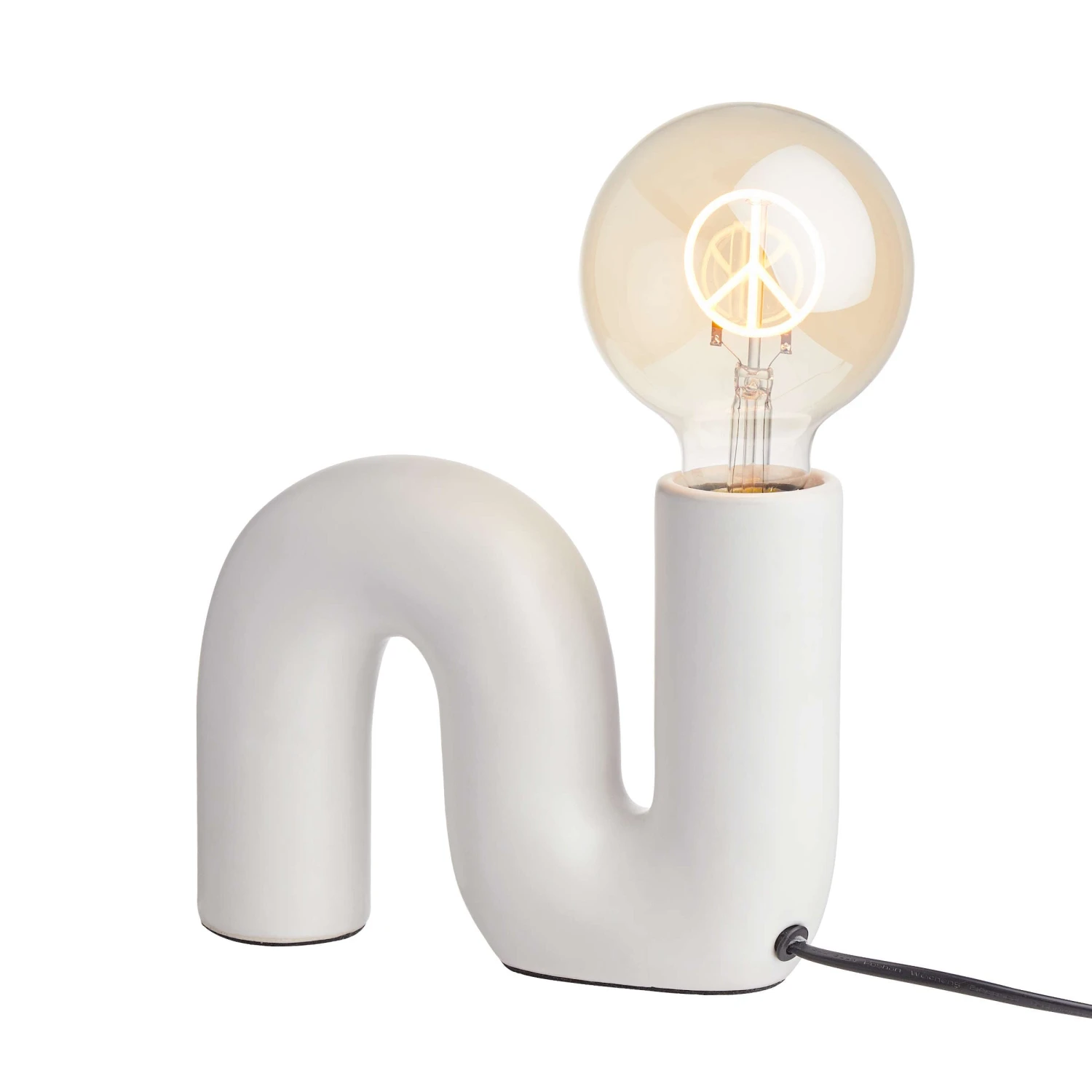 Weil klassische Deckenleuchten oft so etwas Ungemütliches haben, setzen Sie auf die weiße Tube Tischleuchte als moderne Raumbeleuchtung und individuellen Lichtakzent. Die geschwungene Tischleuchte mit Keramikfuß wird mit der Bright Light Glühbirne Peace sogar zum zeitgemäßen Statement, etwa auf dem gedeckten Tisch. Oder Sie kombinieren die Tube Tischleuchte mit einer anderen dekorativen Glühbirne Ihrer Wahl – und schaffen so ein individuelles Highlight für Ihr Zuhause.