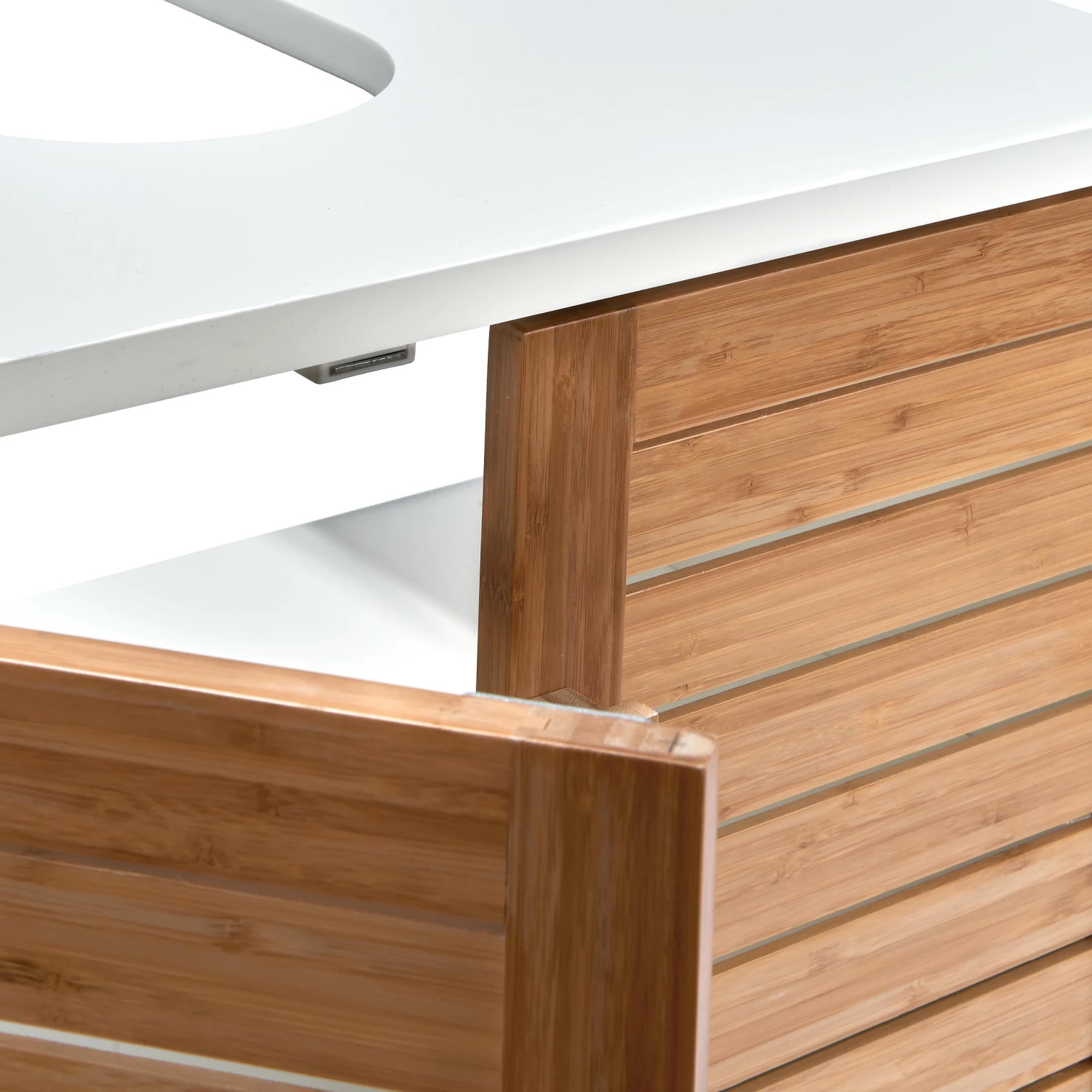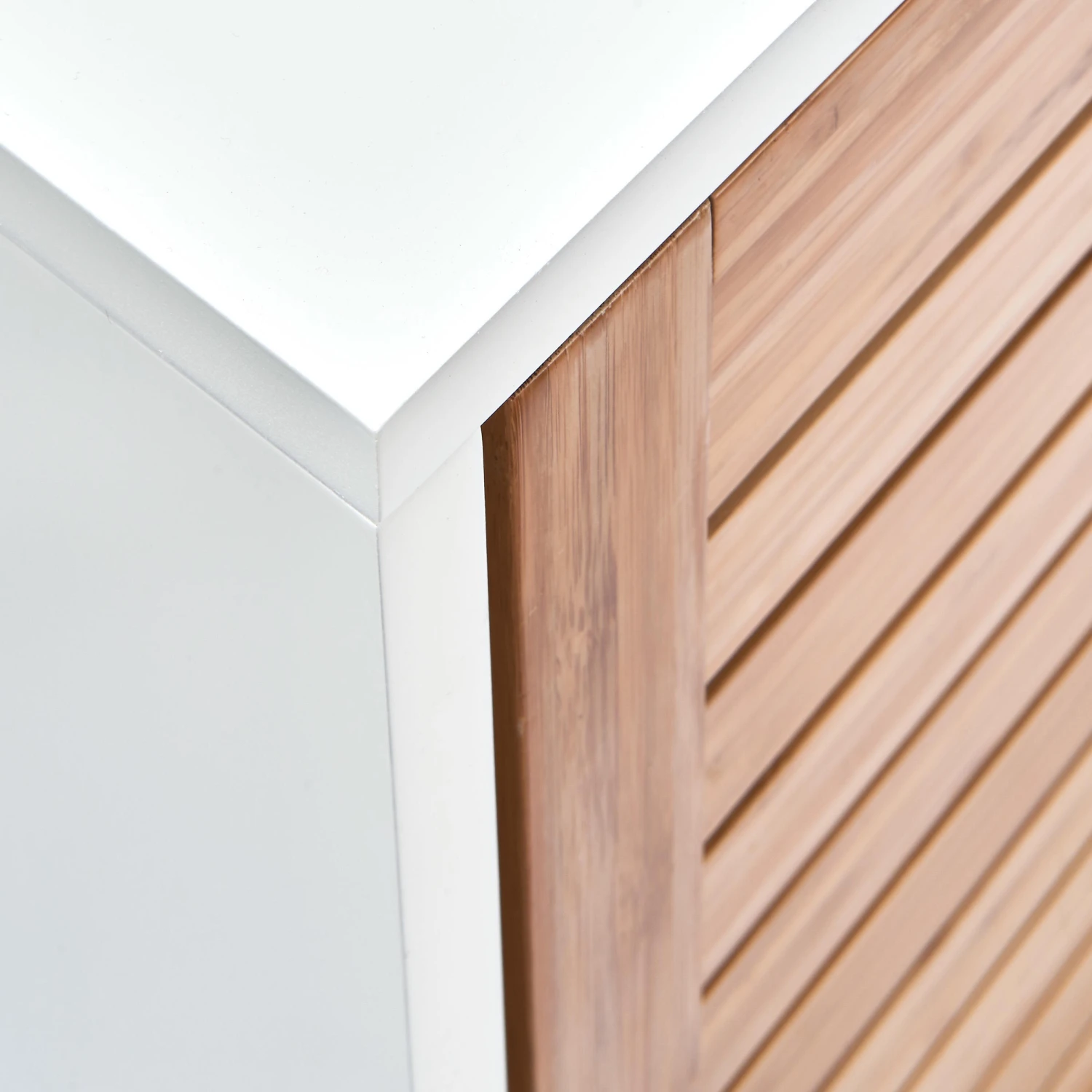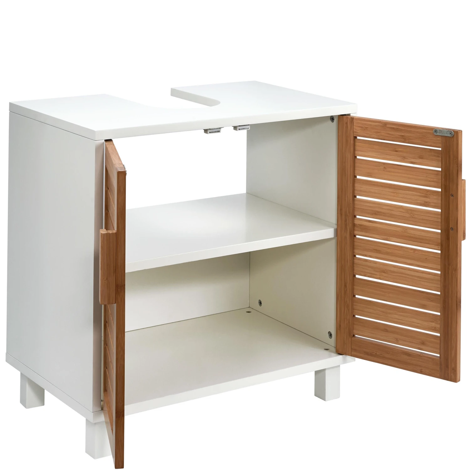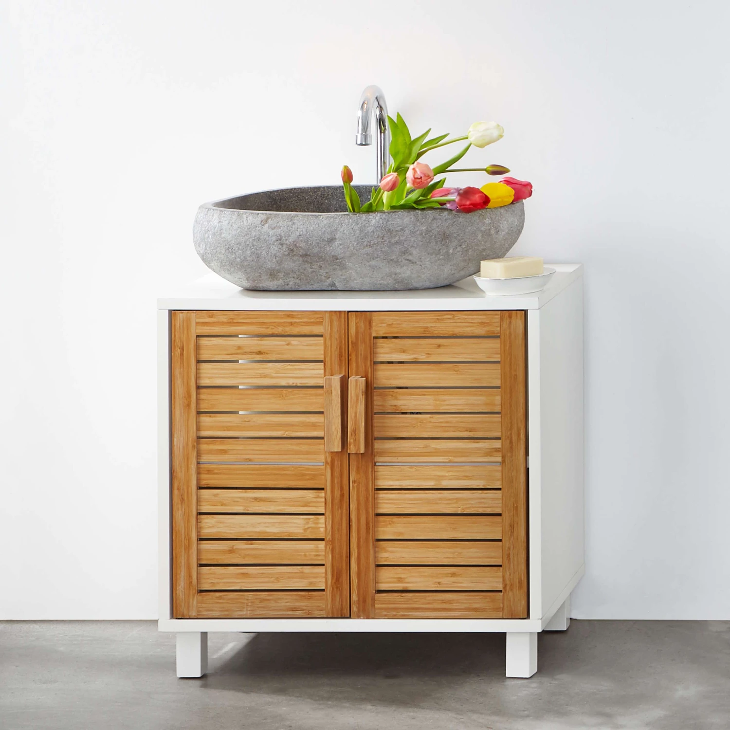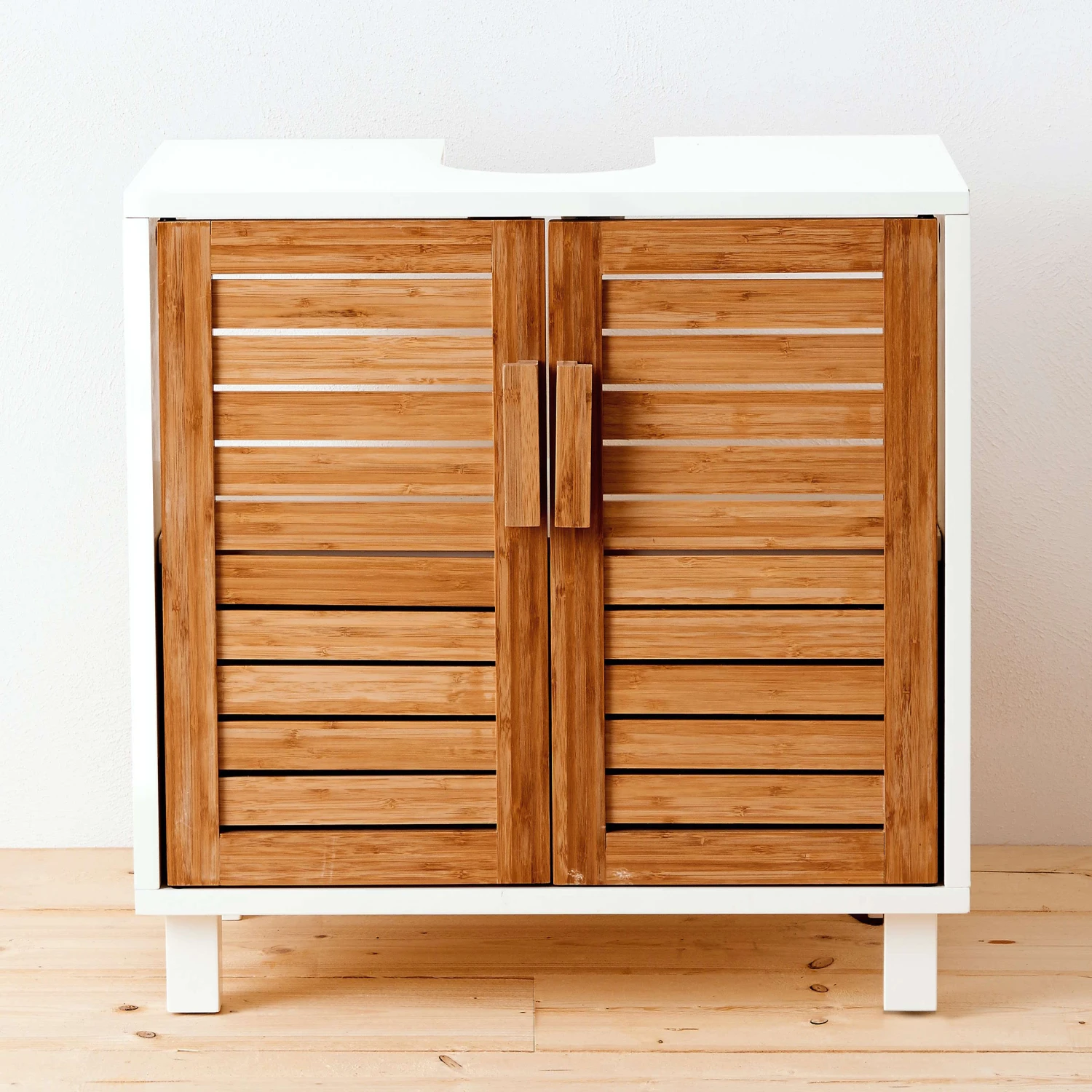 Helle Farben und klare Linien mit praktischer Aufbewahrung in moderner Optik – dieser ordnungsliebende Waschbeckenunterschrank versteht sich direkt mit Ihren Wohnideen und den Anforderungen in Ihrem Badezimmer. Durch die zeitlose Farbkombination aus natur und weiß wirkt er zudem elegant und bietet auf zwei Ebenen optimalen Platz für Ihre Badutensilien. Für ein einfaches Öffnen und Schließen sorgt der Magnetverschluss an den Türen. Durch die Verarbeitung von Bambus, einem schnell nachwachsenden und extrem widerstandsfähigen Rohstoff, punkten Sie zudem in Sachen Nachhaltigkeit. Dies kommt nicht nur der Umwelt zugute, sondern zeigt sich auch in der Langlebigkeit unserer Möbel. Weitere Produkte der Serie erhältlich.